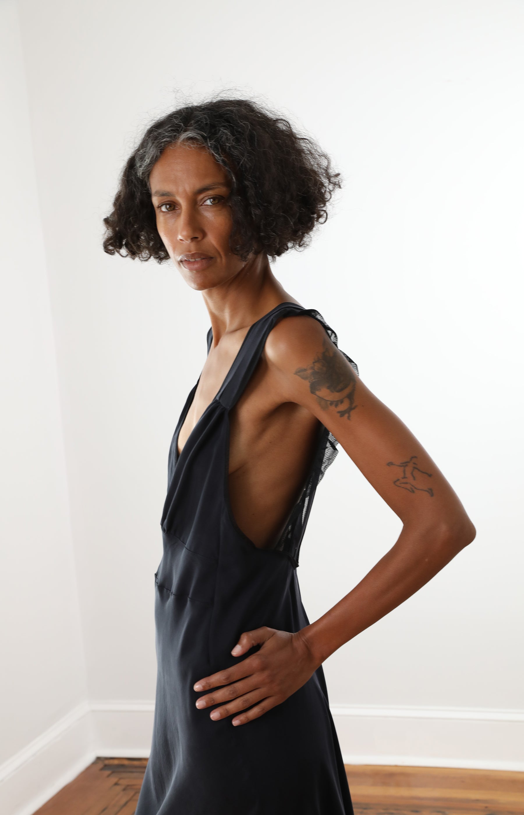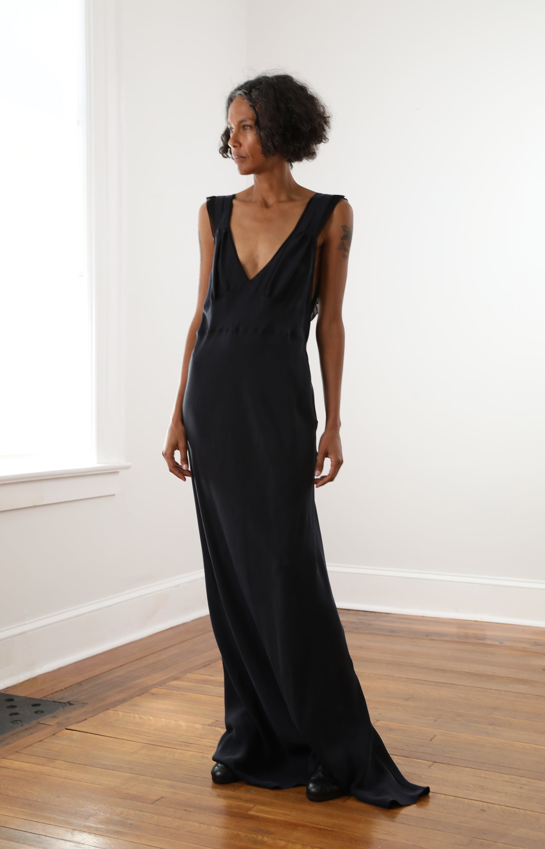 Colleen Allen full length bias silk dress with low back and silk tulle detailing on the straps.