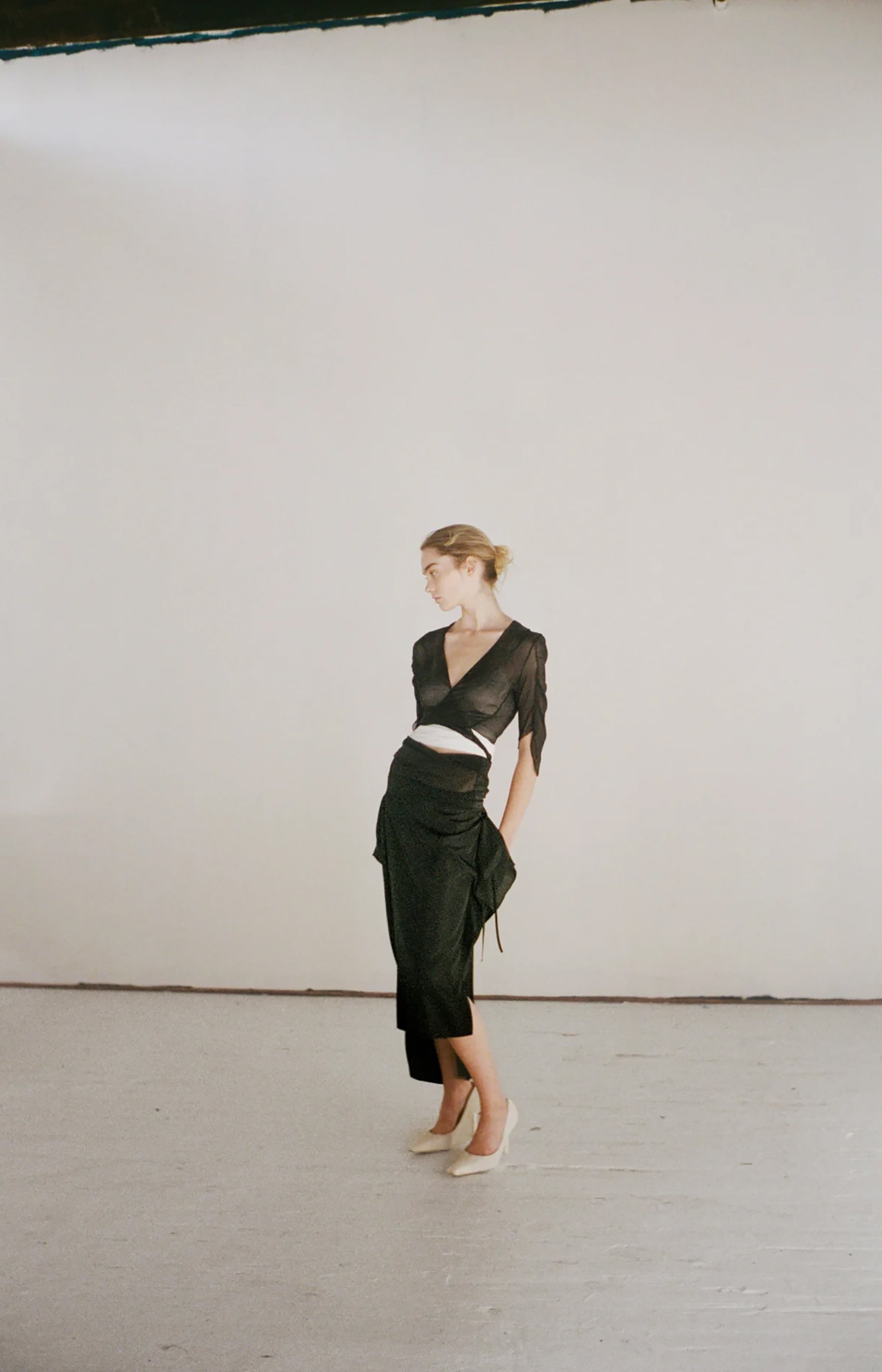 Colleen Allen washed silk chiffon short sleeve ballet top with wrap closure and gathered detailing at sleeve.