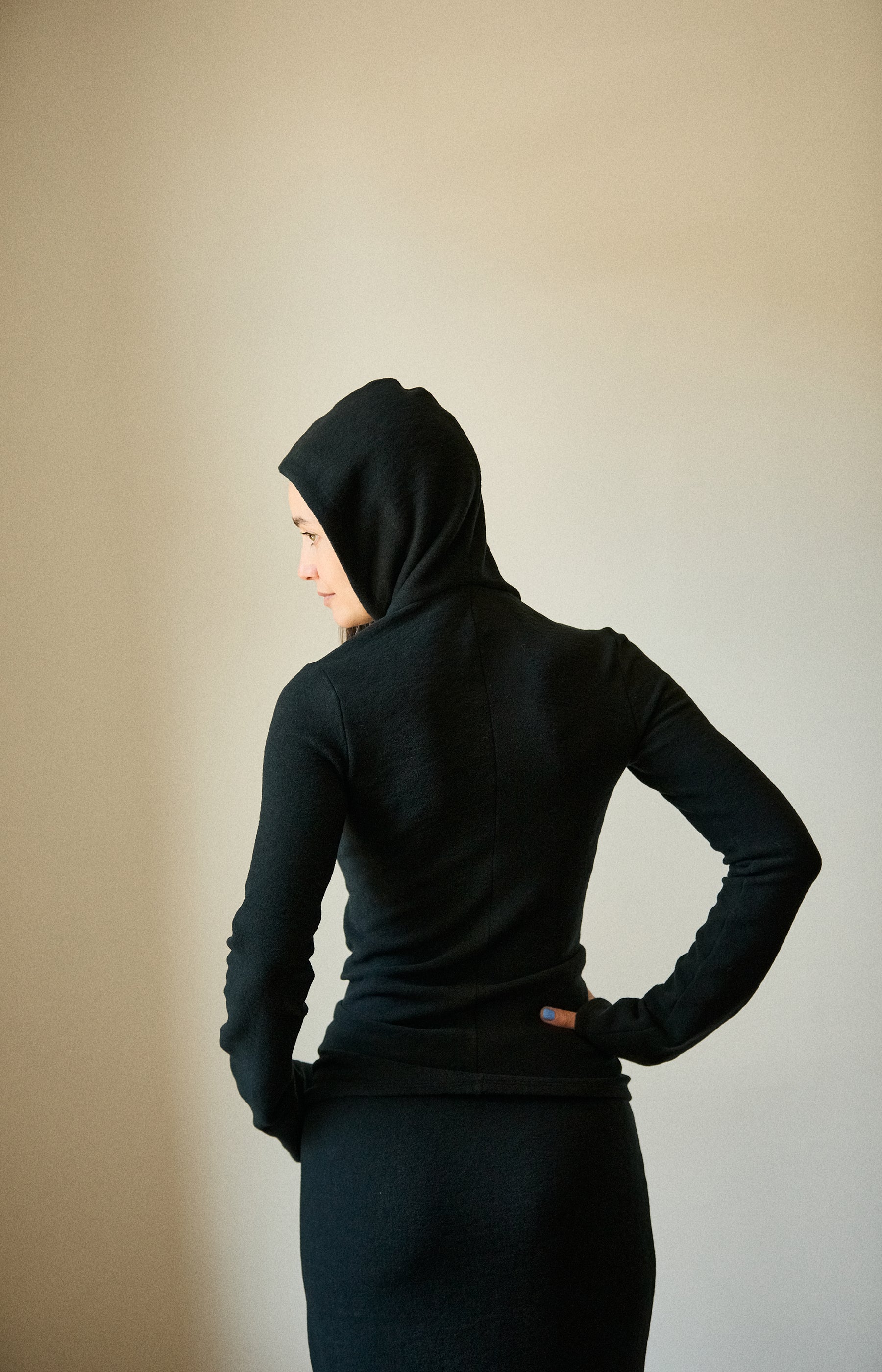 Colleen Allen full length brushed wool jersey skirt with drawstring waist.
