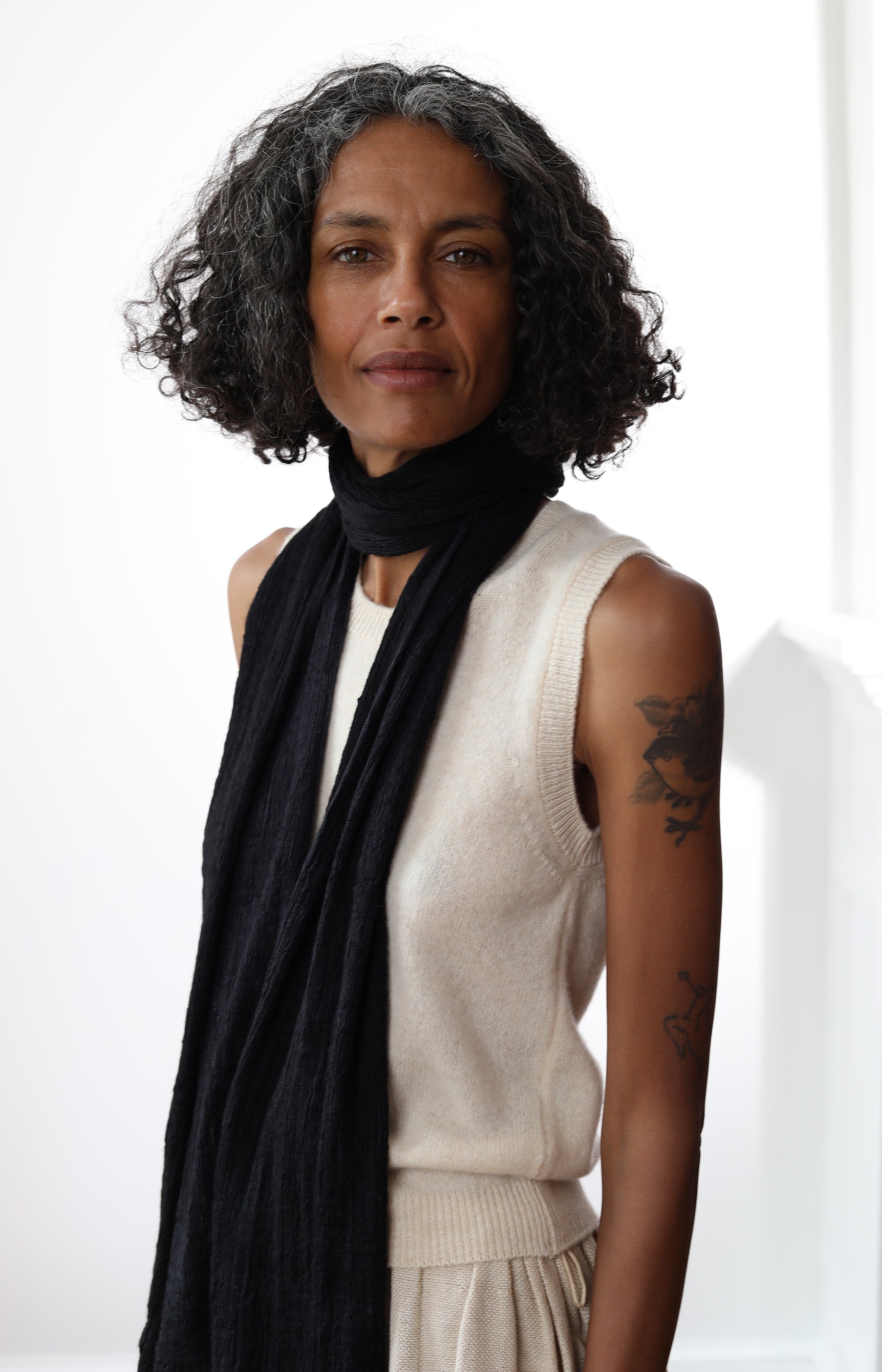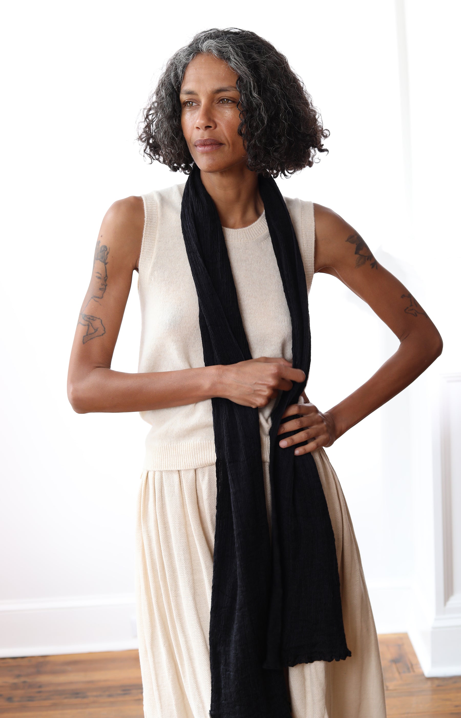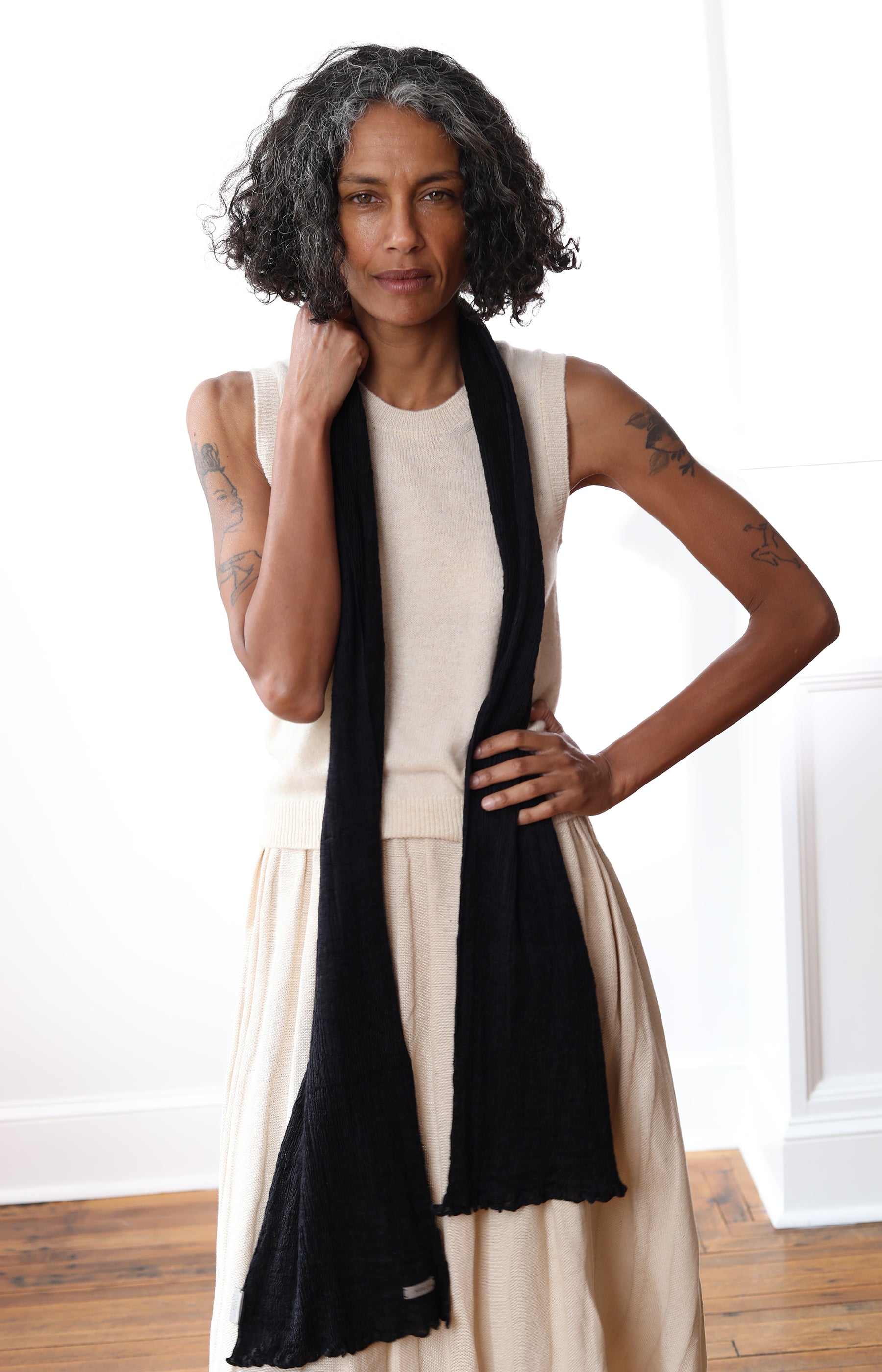 Norlha black Feather Ripples scarf. This lightweight scarf is made from a yak khullu and silk blend, a luxurious combination of fibers that creates a crinkled effect in the fabric. With its narrow width, it can be wrapped around the neck while keeping a slender profile.