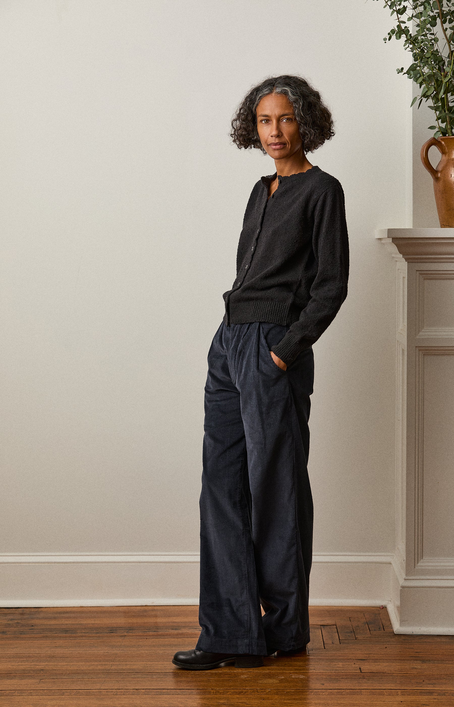 Emma Rothkopf black cardigan is a cozy knit made from organic cotton bouclé for a soft, textured feel. Has natural horn buttons and a delicate scallop detail along the placket and neckline.