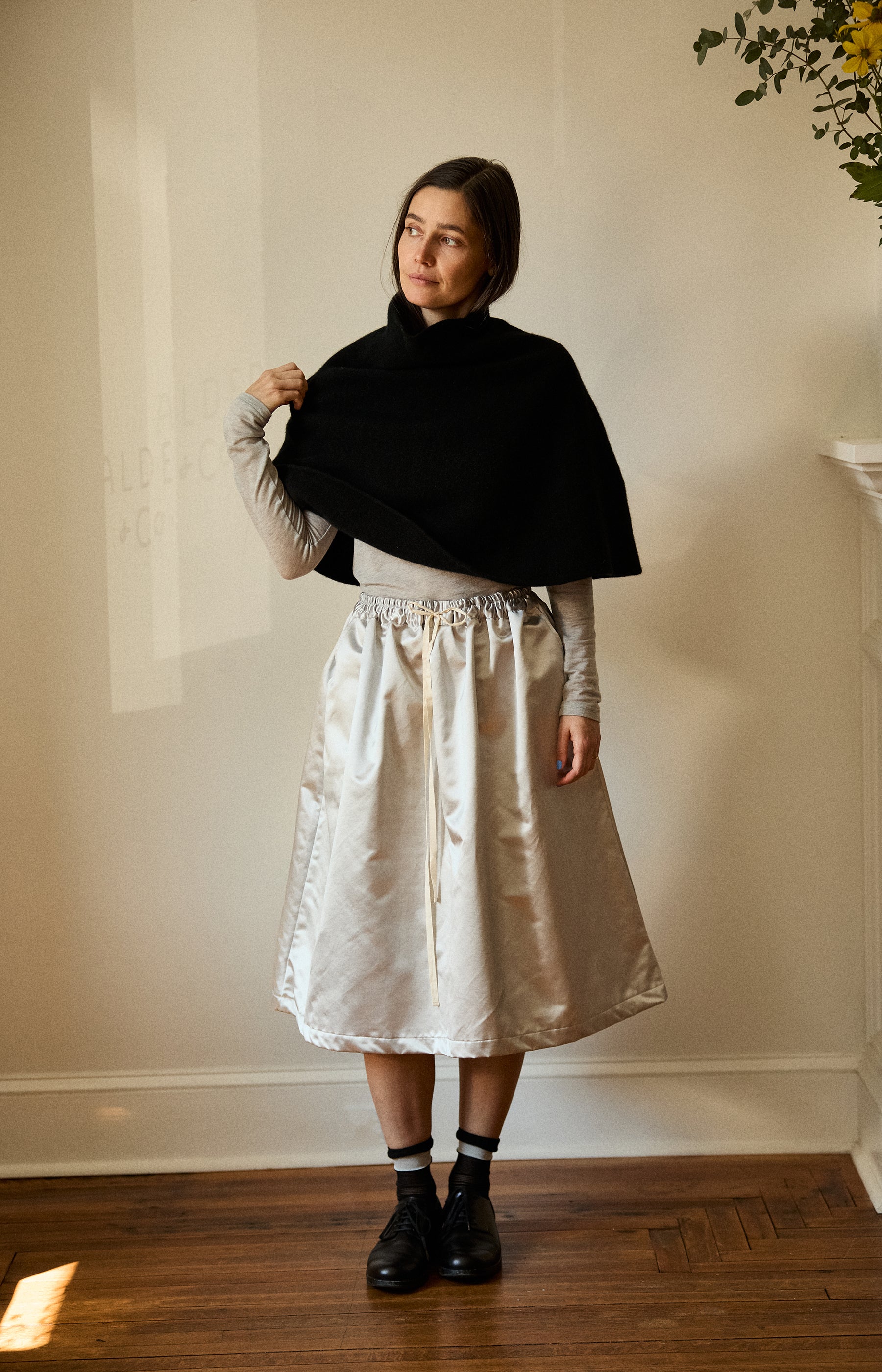 Cecilie Telle black half neck poncho. Pullover style with a mock neck and seamless construction, hand knitted and felted in London using wool from the UK.