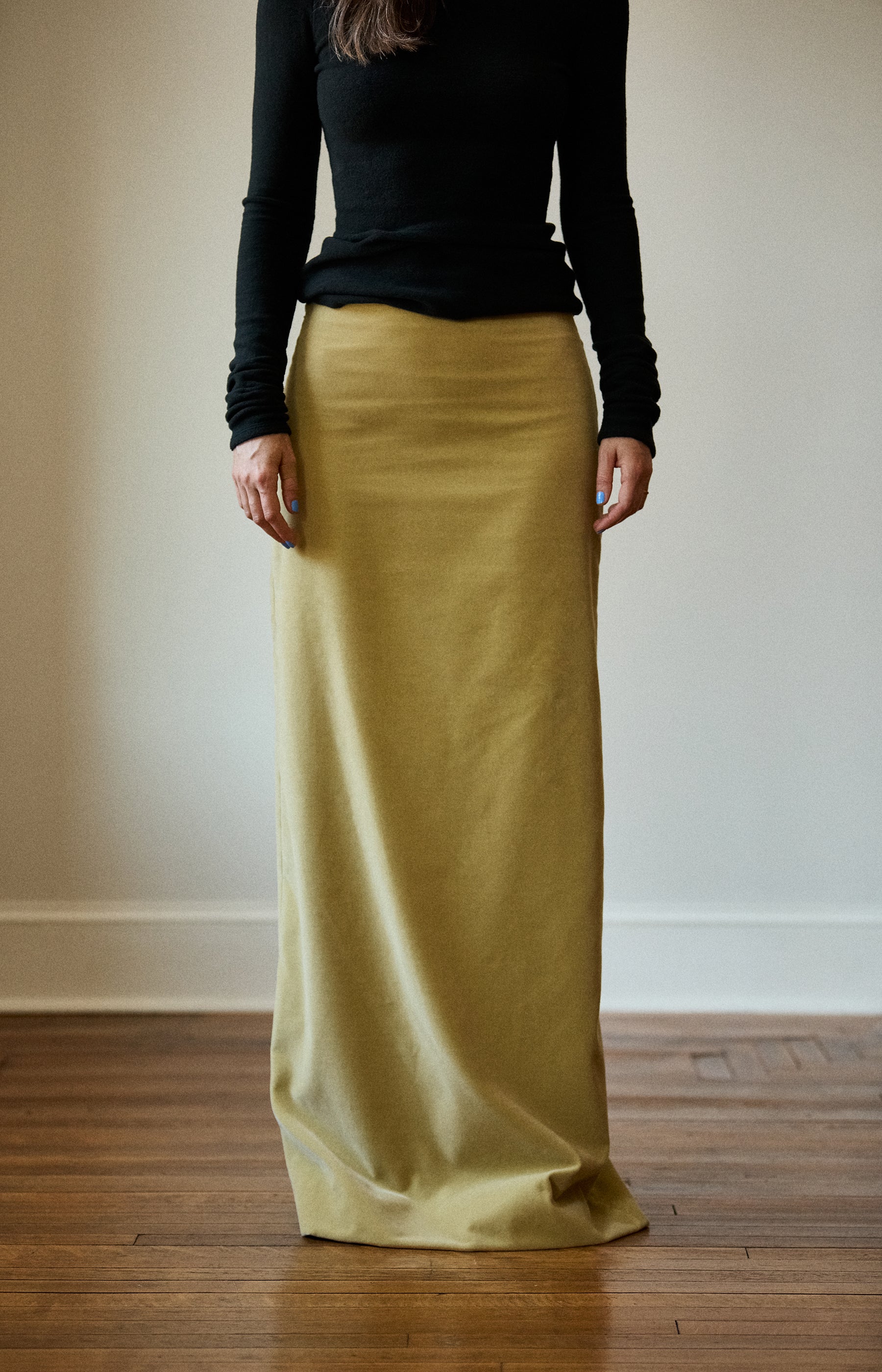 Colleen Allen full length velvet skirt with shaped back seaming, high back slit with drape detail. Fully lined in silk with side seam invisible zipper closure.