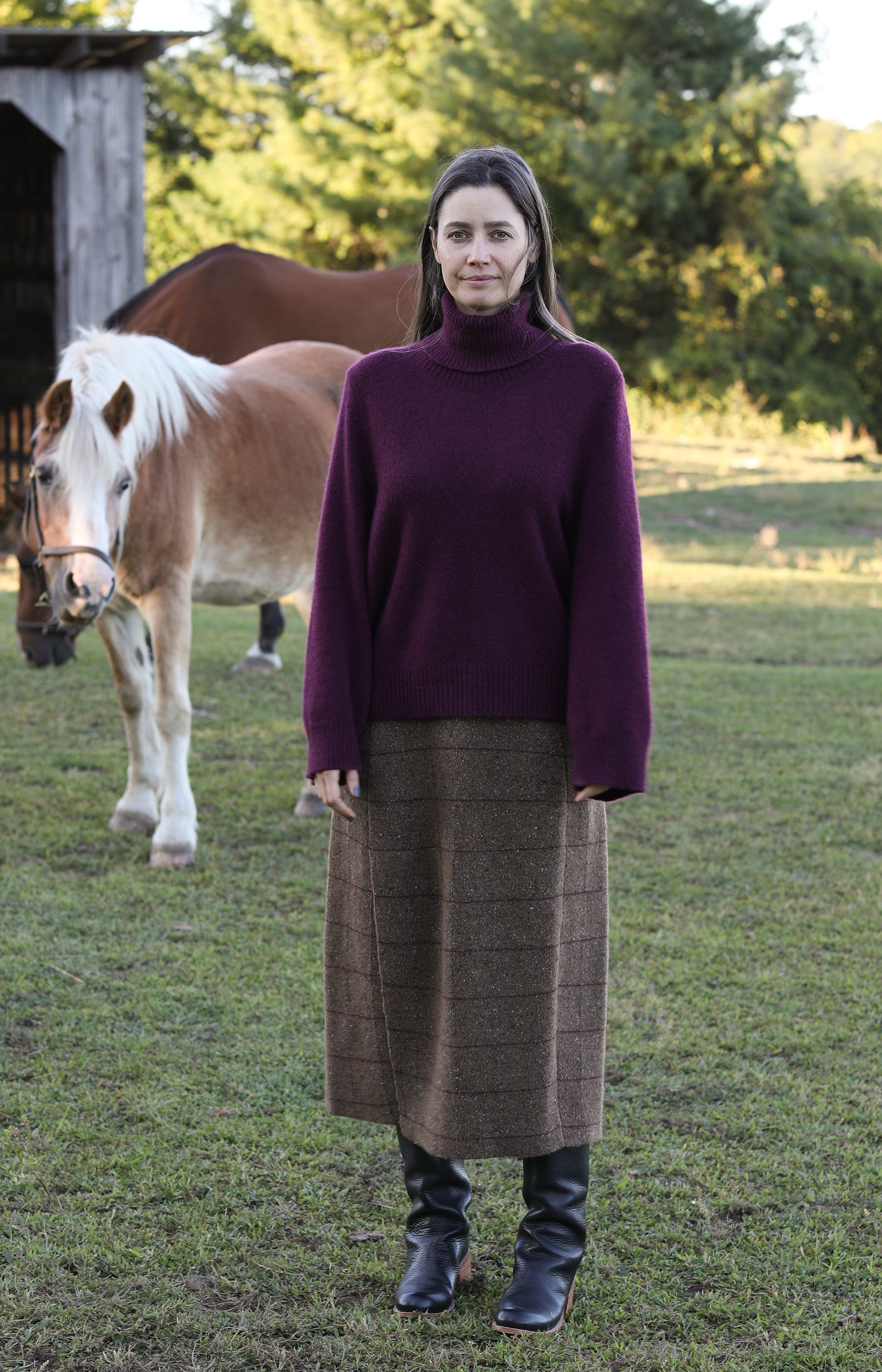 Boboutic cherry sweater in a super soft cashmere blend with a beautiful drape and a banded turtleneck collar, hem and cuffs.