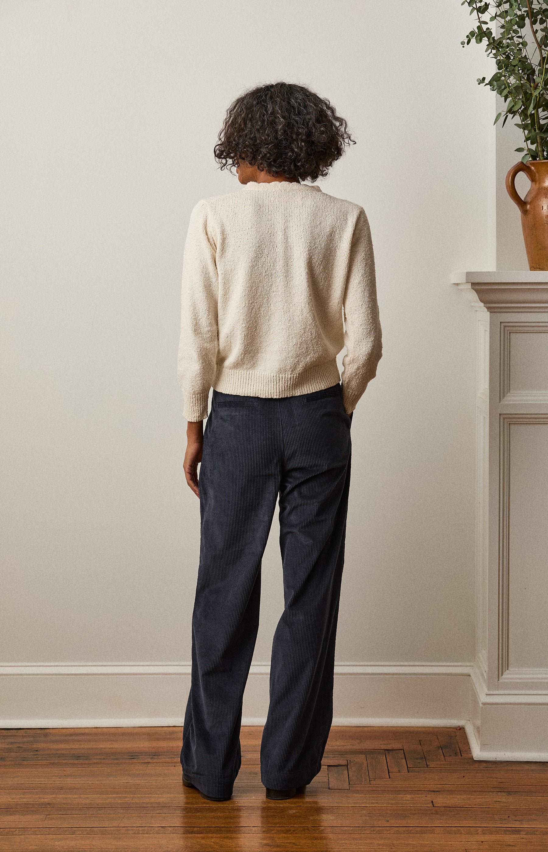 Emma Rothkopf cream ski henley, inspired by Emma's mom’s childhood sweater. Reimagined in a nubby organic cotton yarn with 4 horn buttons. This style is slightly shrunken and has a high arm hole. If you prefer a looser fit, size up.