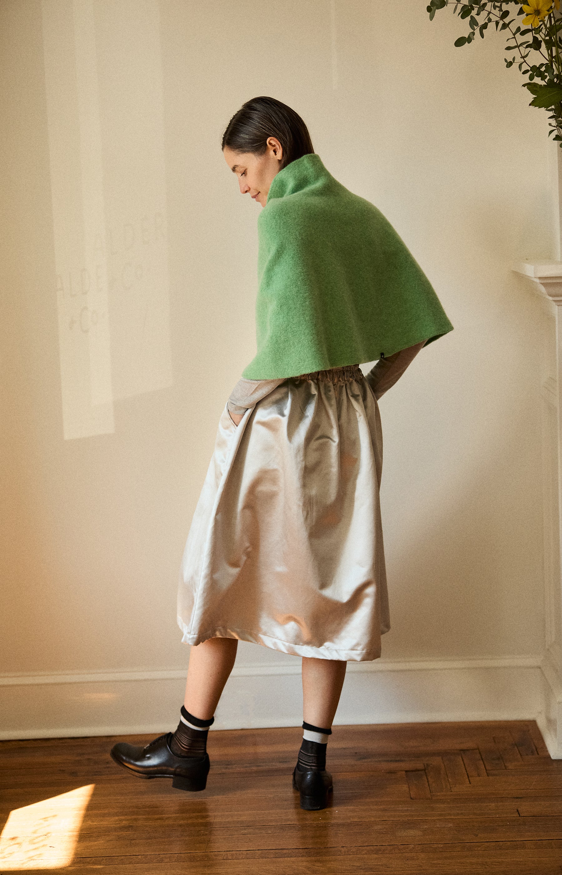 Cecilie Telle springtime green half neck poncho. Pullover style with a mock neck and seamless construction, hand knitted and felted in London using wool from the UK.