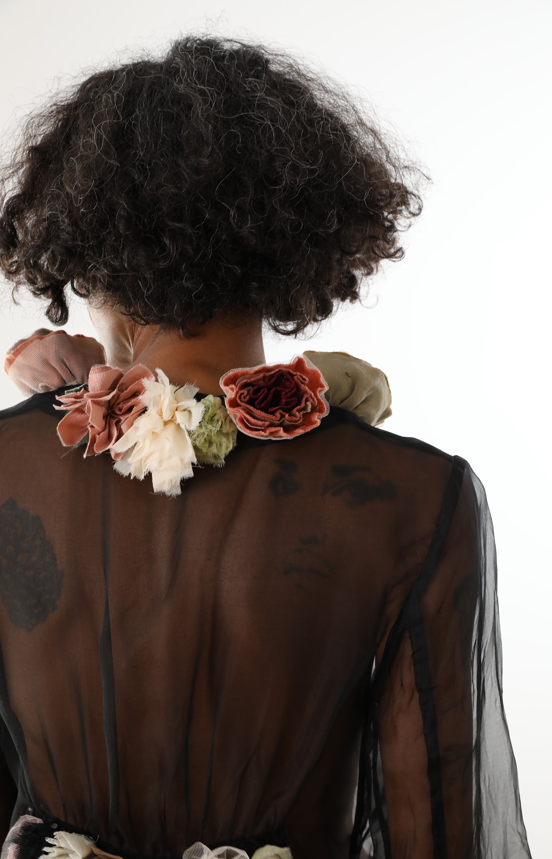 Aleksandr Manamïs sheer black organza shirt with handmade floral details.