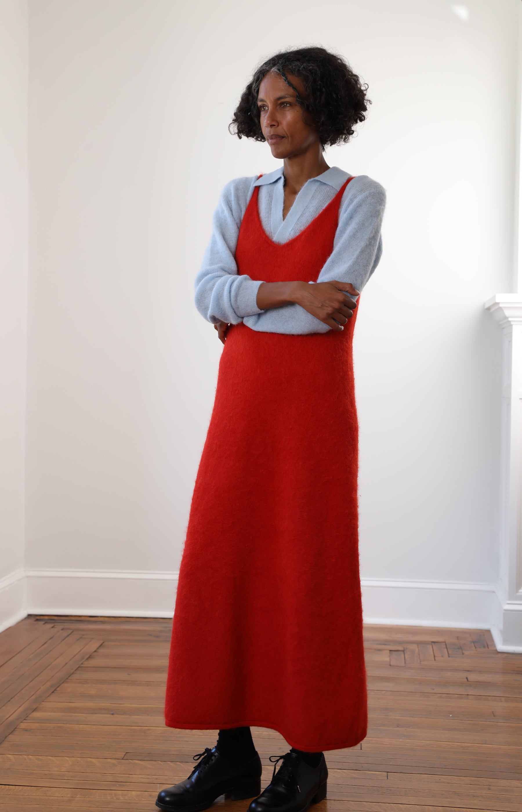 Auralee dress in red. A knit made from carefully selected baby alpaca fibers, with only the finest and thinnest strands handpicked from the raw wool. The yarn is spun through a traditional worsted process and expertly knitted to create a luxurious fabric. Using this exclusive yarn, produced in limited quantities by skilled artisans, this piece features a high-quality, bright white base. After knitting, it undergoes product dyeing and a soft fur finish, resulting in a fabric with a gentle nap and a soft, smooth texture.