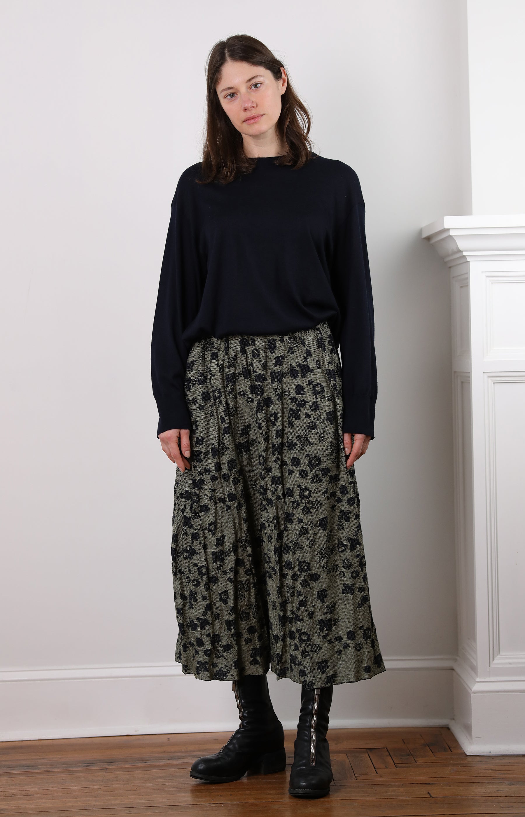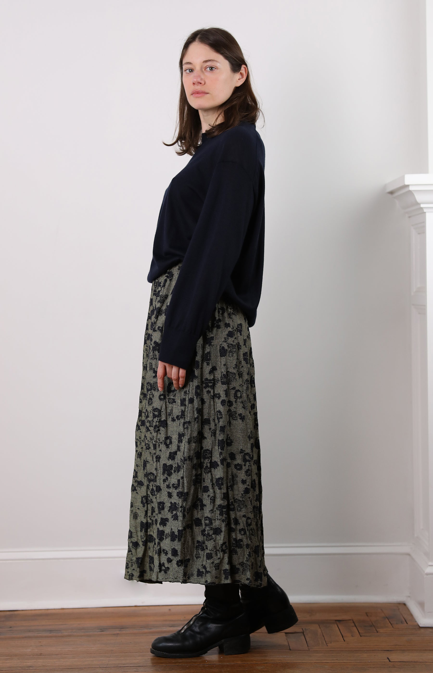 Boboutic pull on skirt crafted from a rich green and dark navy tapestry fabric. Features an elastic waist for a comfortable, flexible fit and side slit pockets. The fabric is wonderfully soft to the touch with a beautiful, fluid drape. Effortless style and everyday wearability.