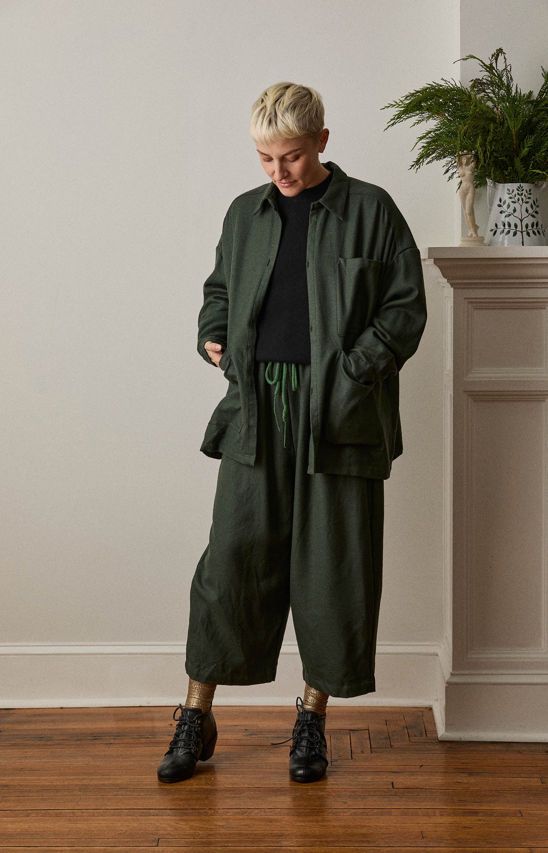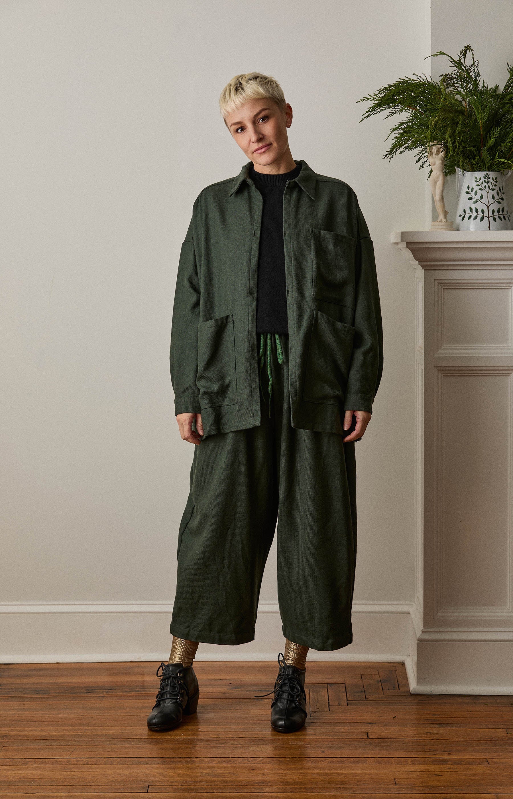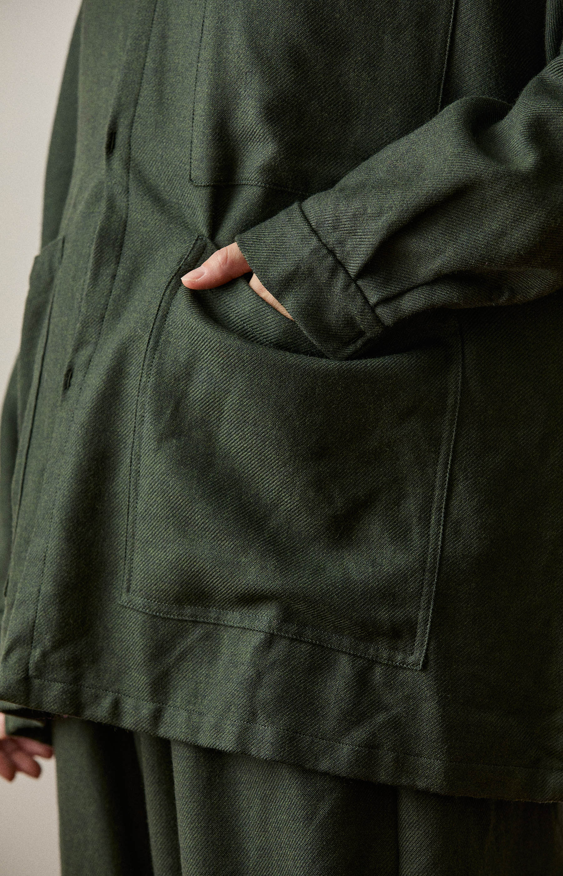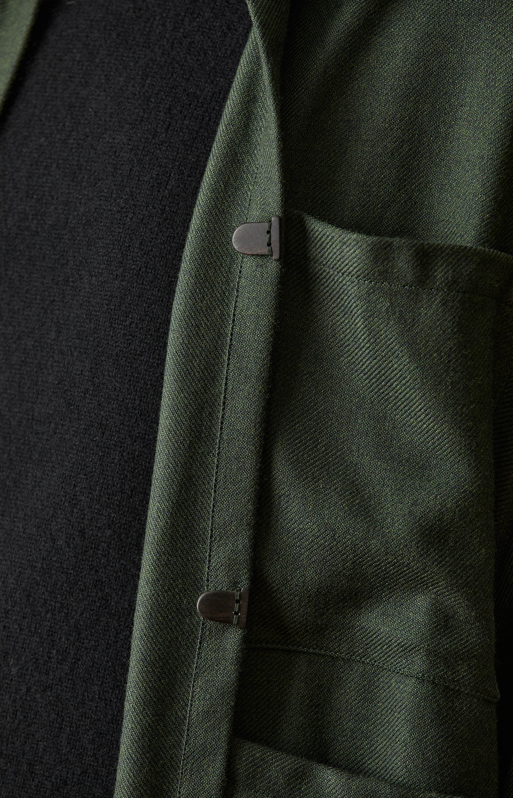 Risa Nakamura dark green wool twill shirt with front patch pockets, single chest pocket and hidden hook & eye closure.