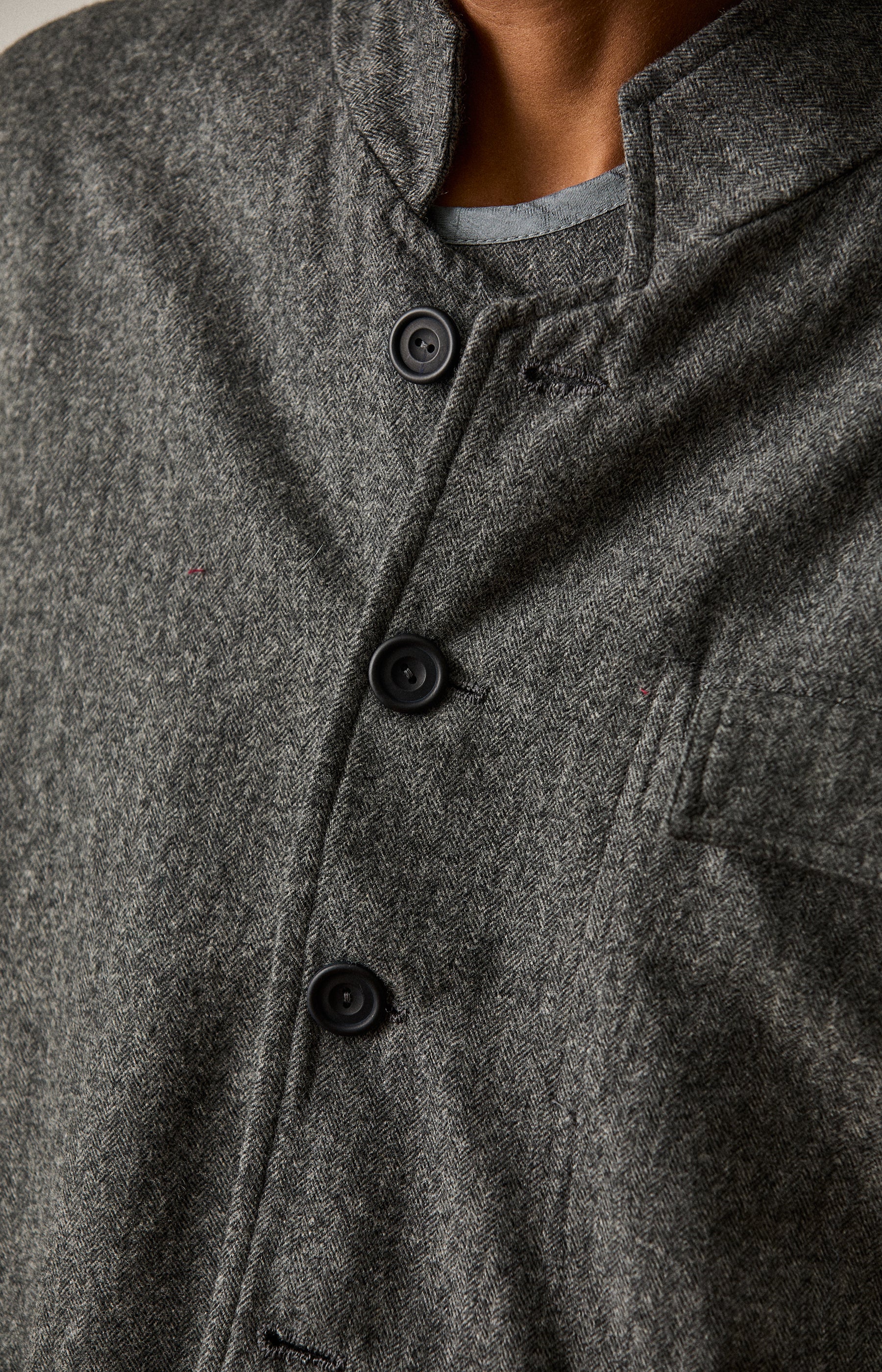 Ricorrrobe grey wool flannel jacket with striped silk lining, front patch pockets, chest patch pocket, notched collar and button front.