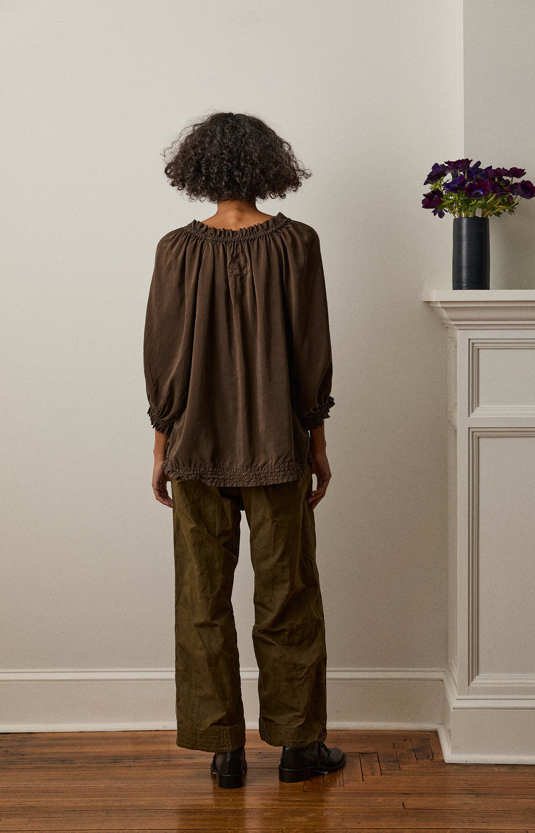 Chez Vidalenc Kiiko top in khaki brown silk habotai. Pull over style with pleated gathered neckline and cuffs.