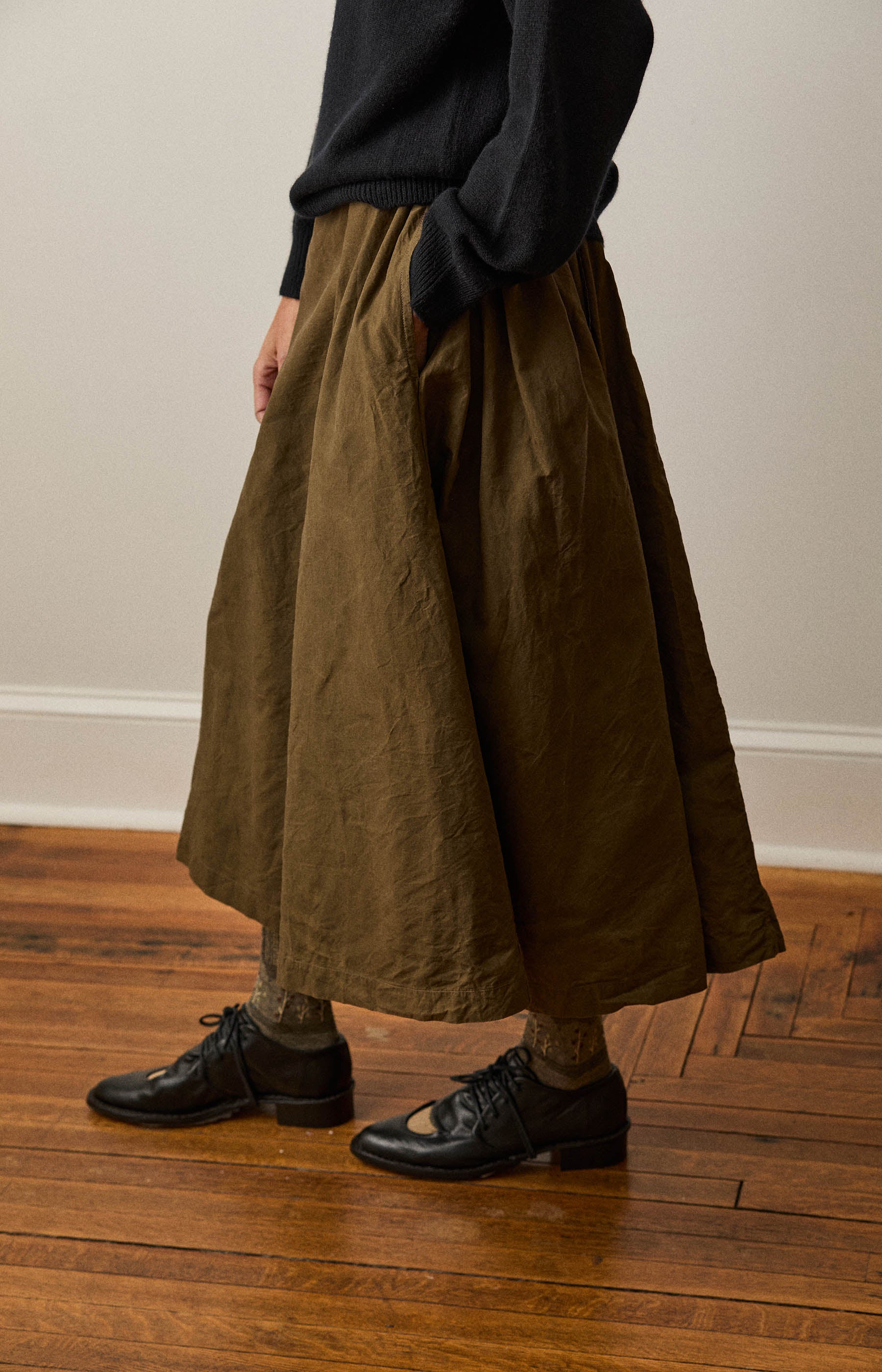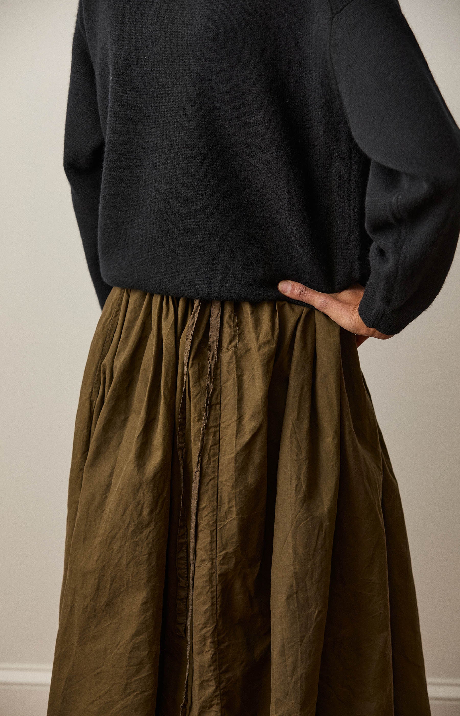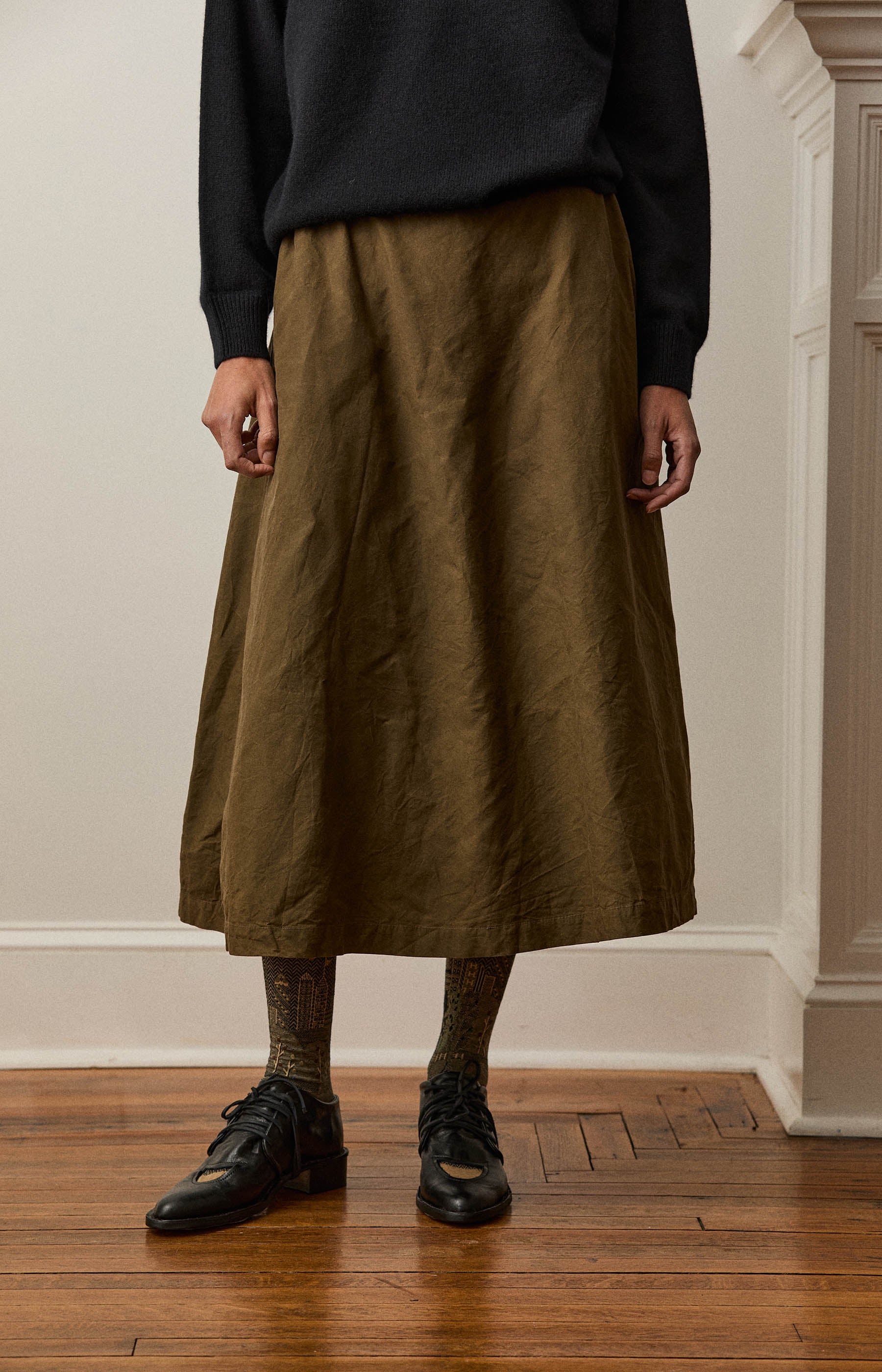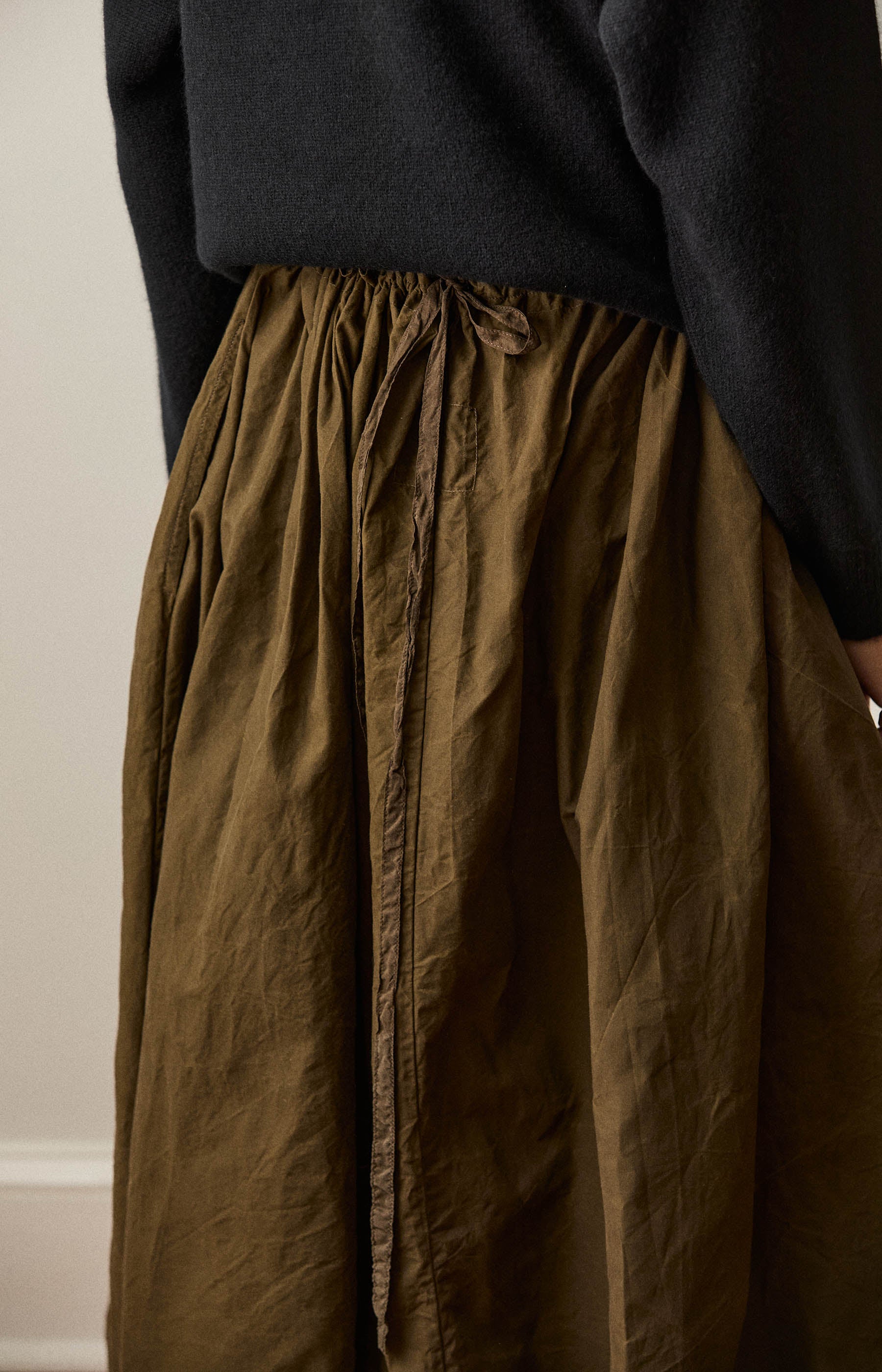 Chez Vidalenc Jeany skirt in khaki green cotton Sailor cloth. Has a flat front waist with back drawstring that creates ruching, a tonal silk tie and side pockets.