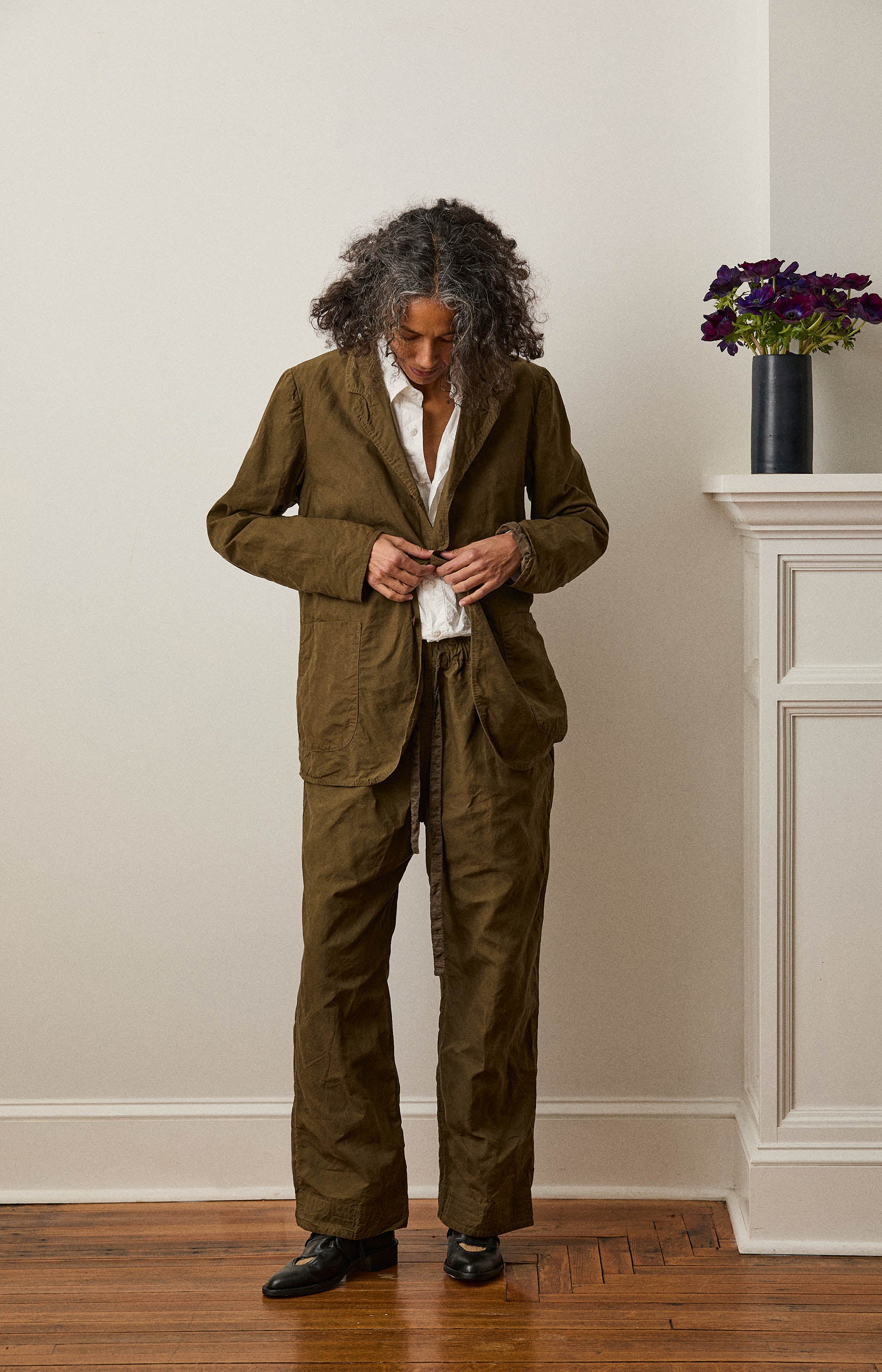 Chez Vidalenc P3 jacket in khaki green cotton Sailor cloth. Relaxed style with front patch pockets and three button front.