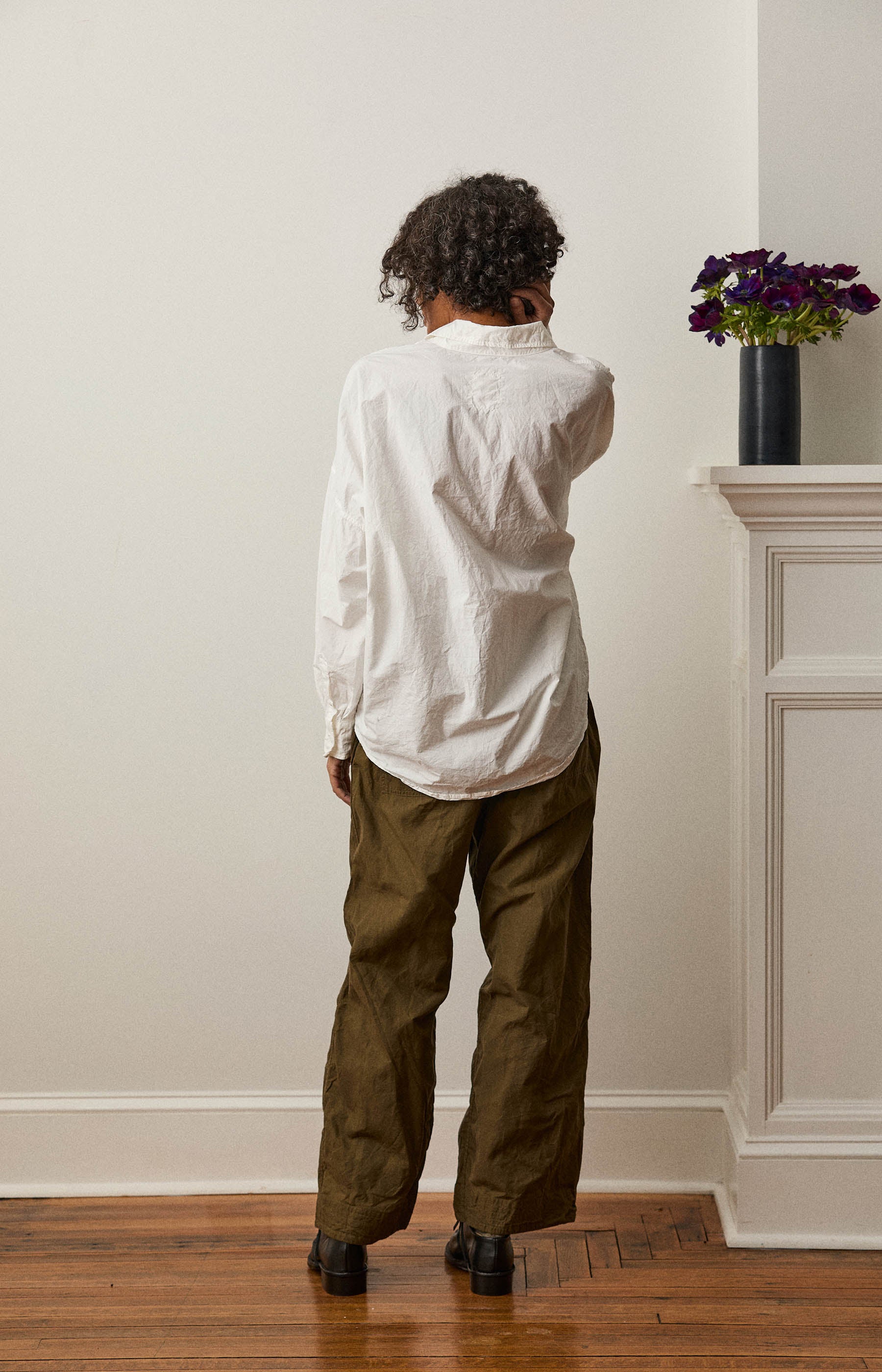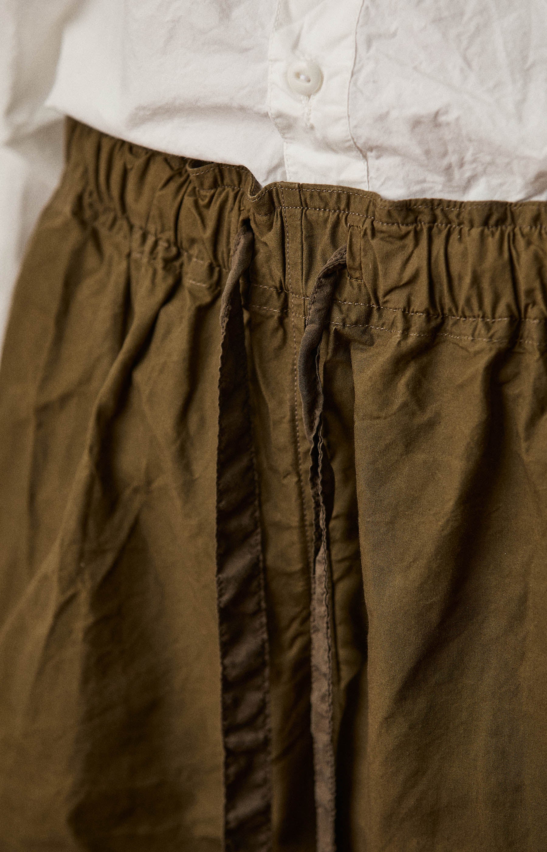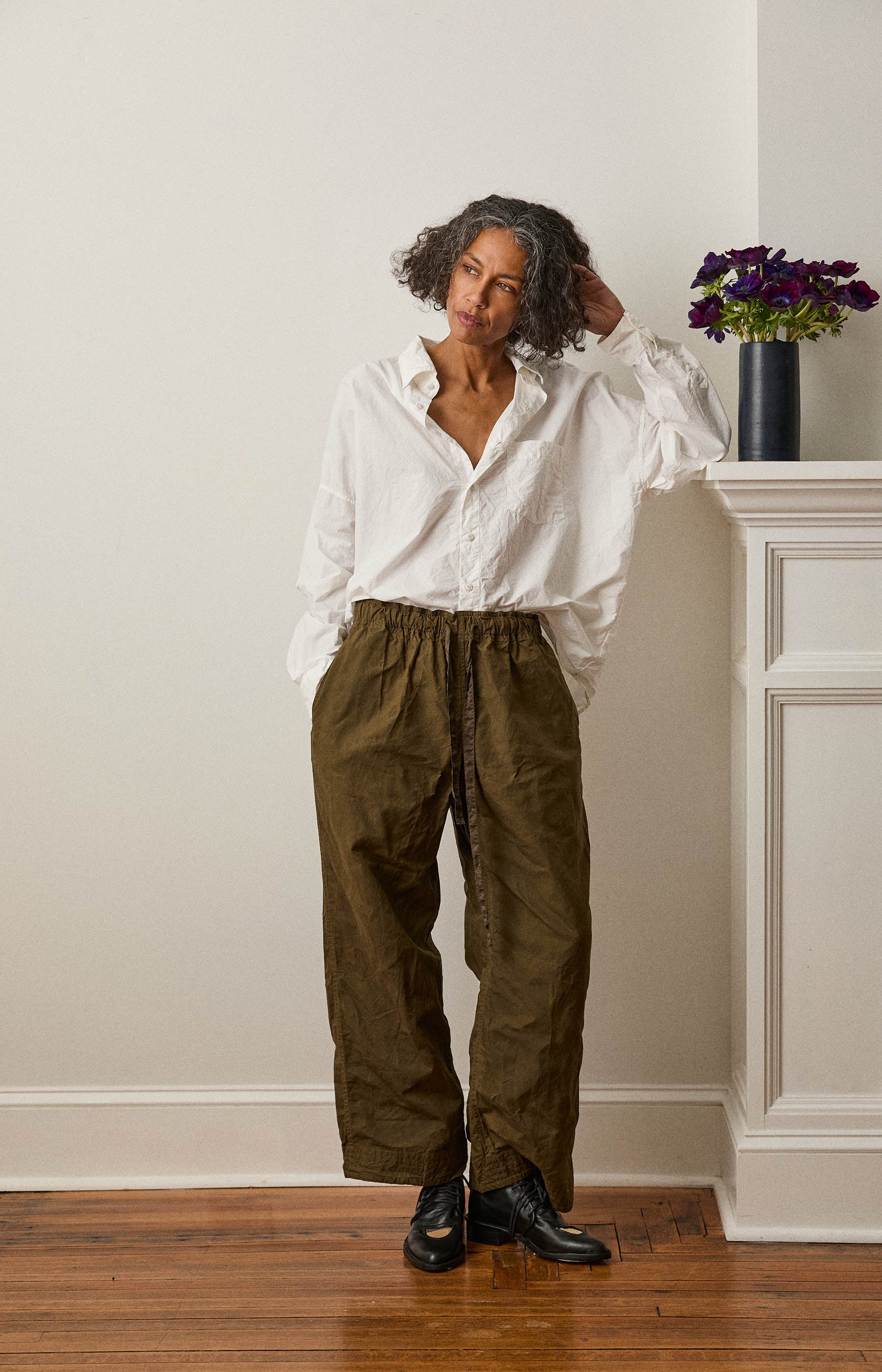 Chez Vidalenc Coulisse pants in khaki green cotton sailor cloth. Pull on style with elastic waist with drawstring tie and side pockets.