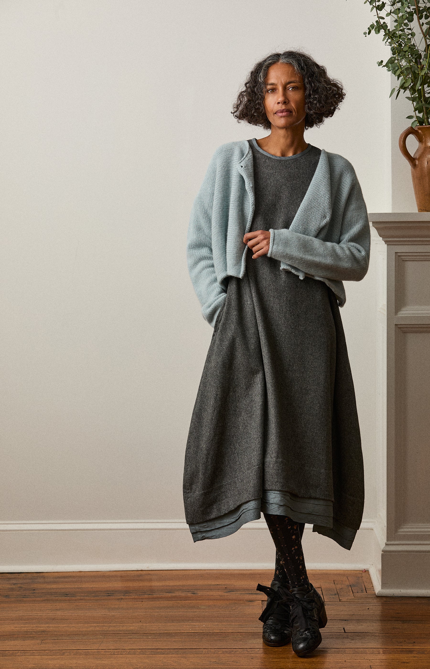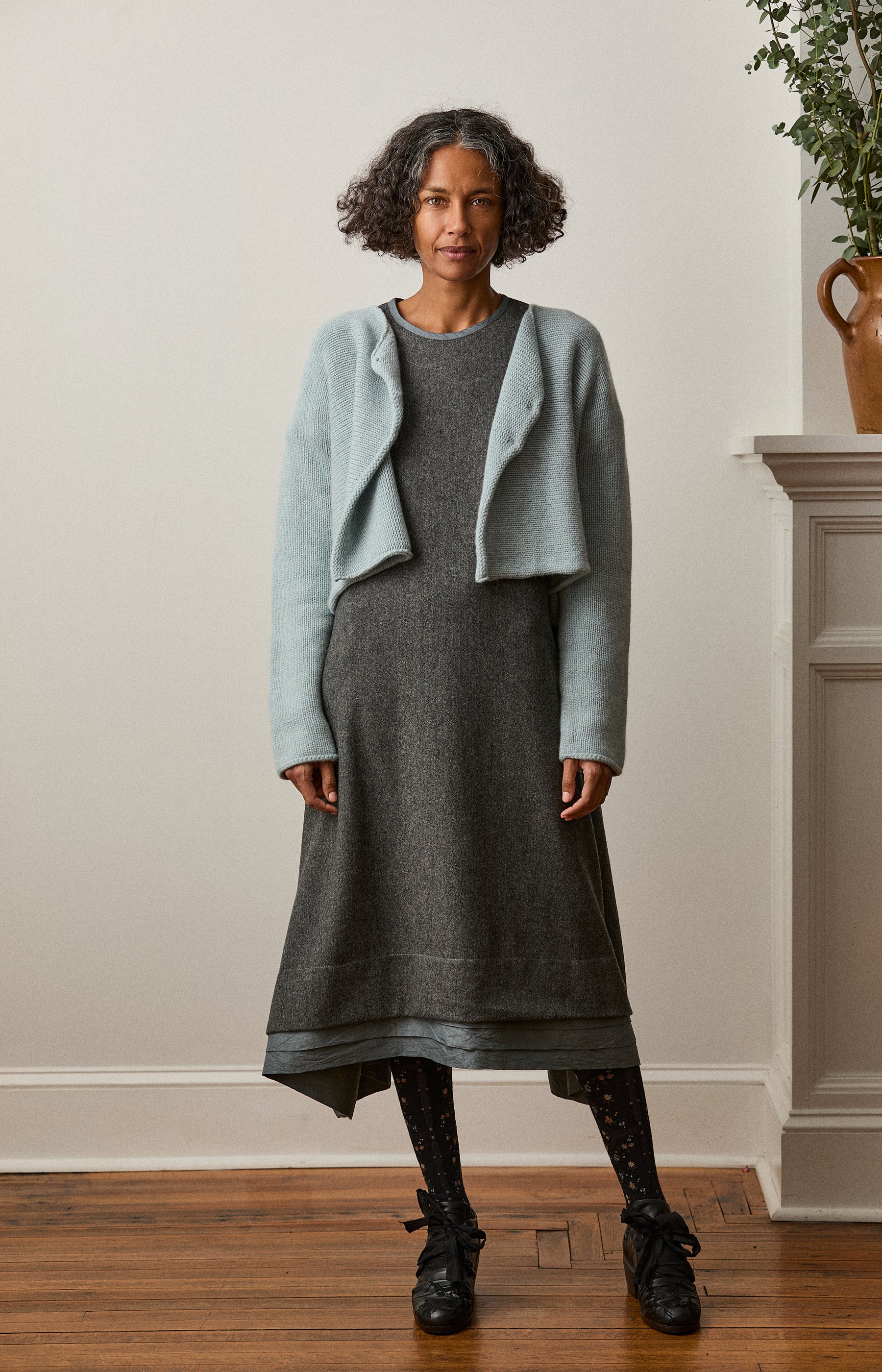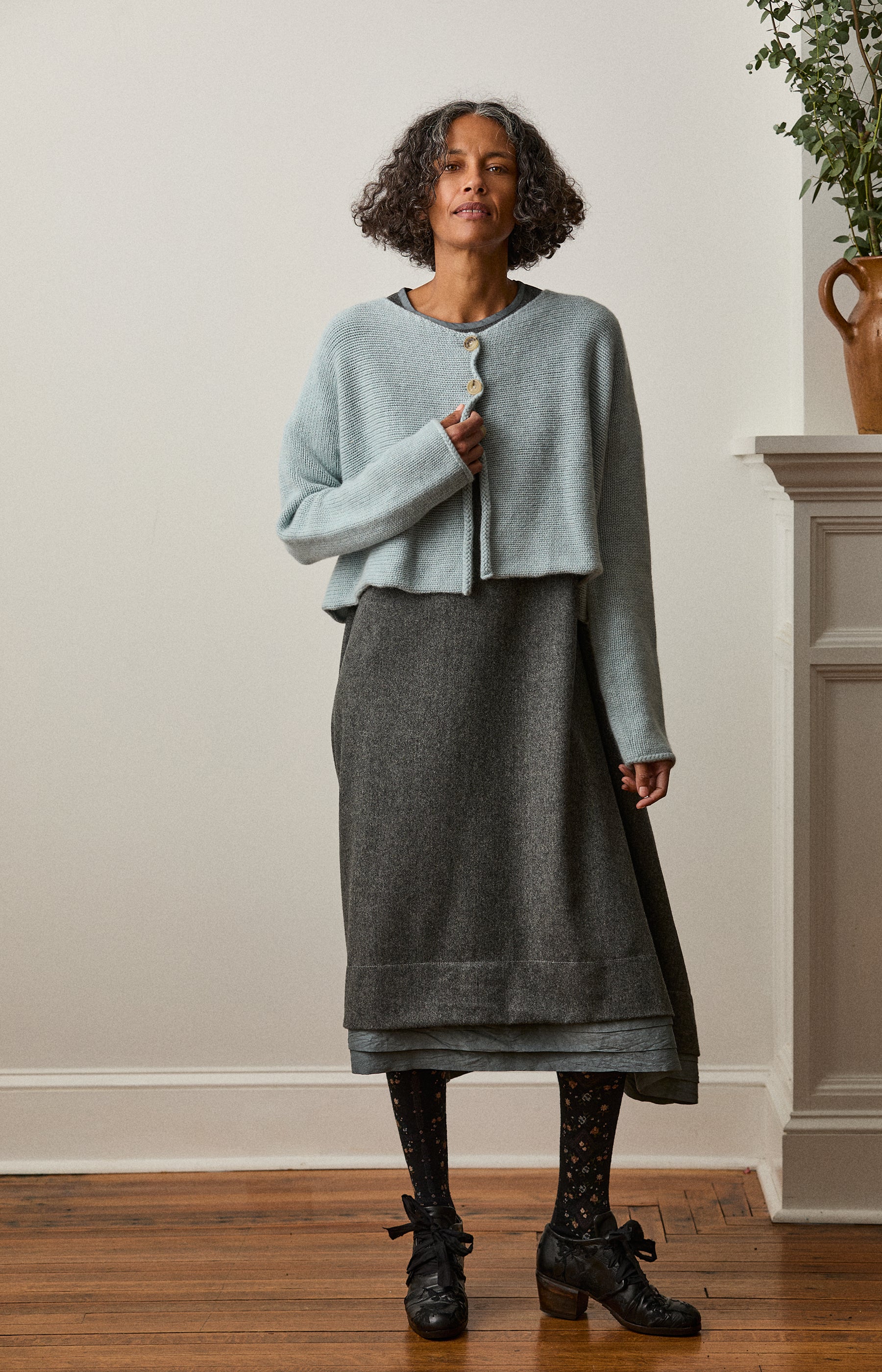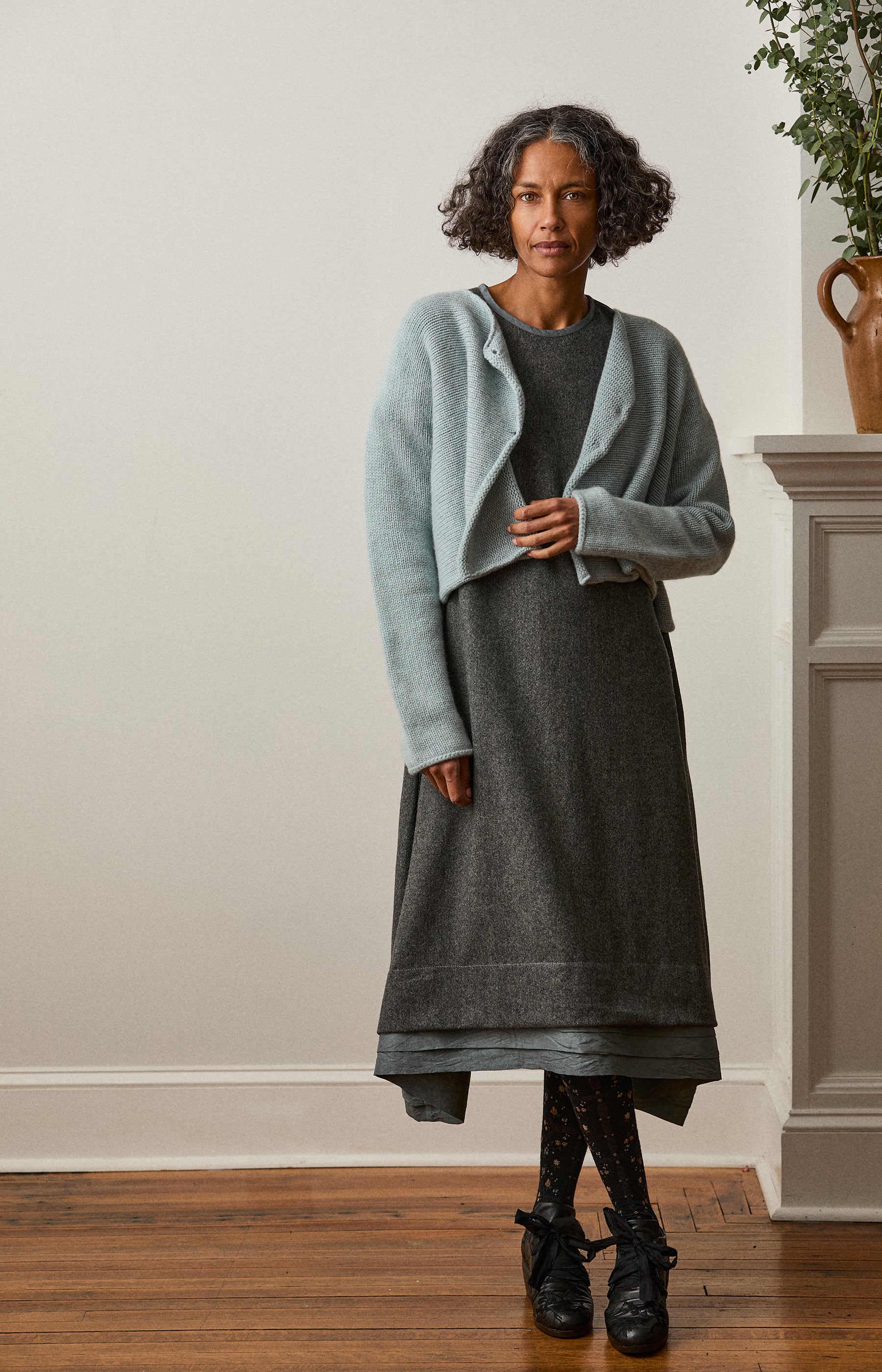 Nitto aqua cashmere cropped cardigan with boxy fit and three button closure.