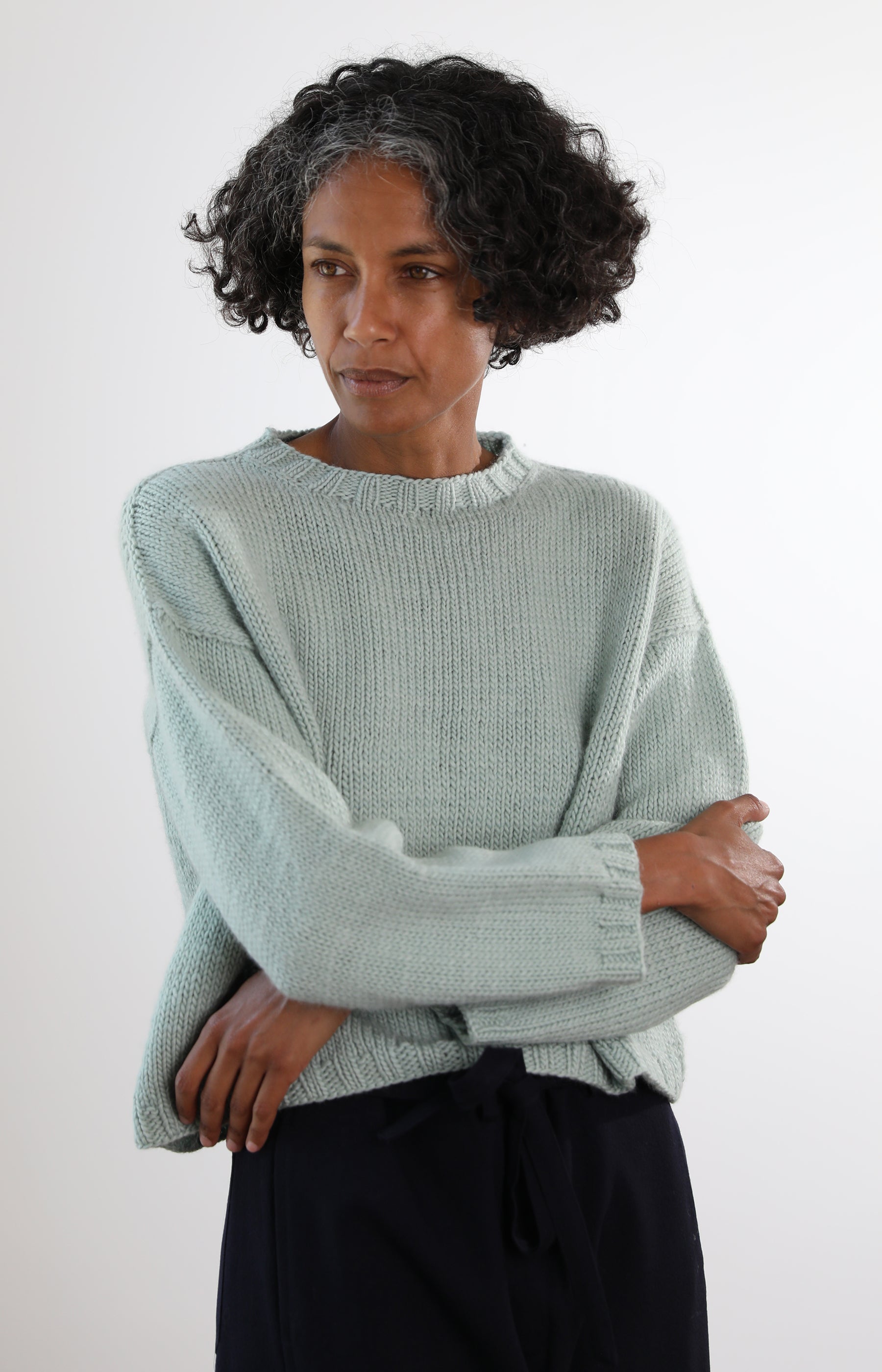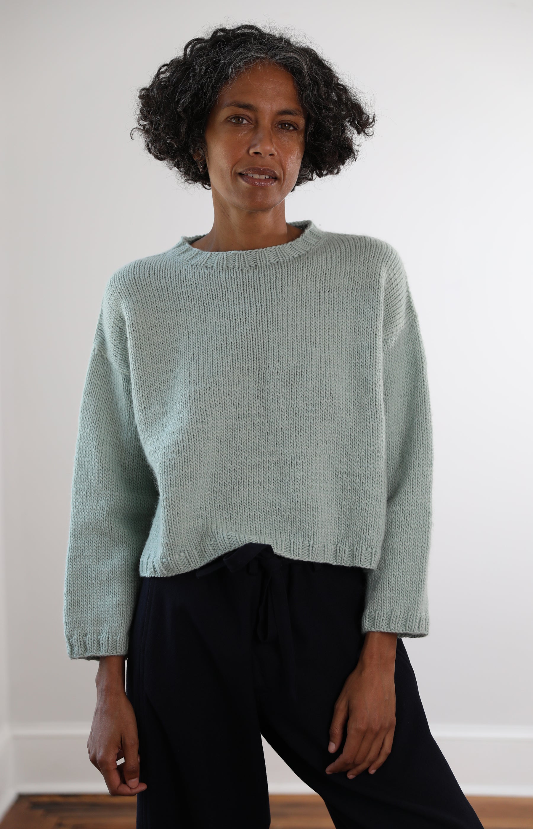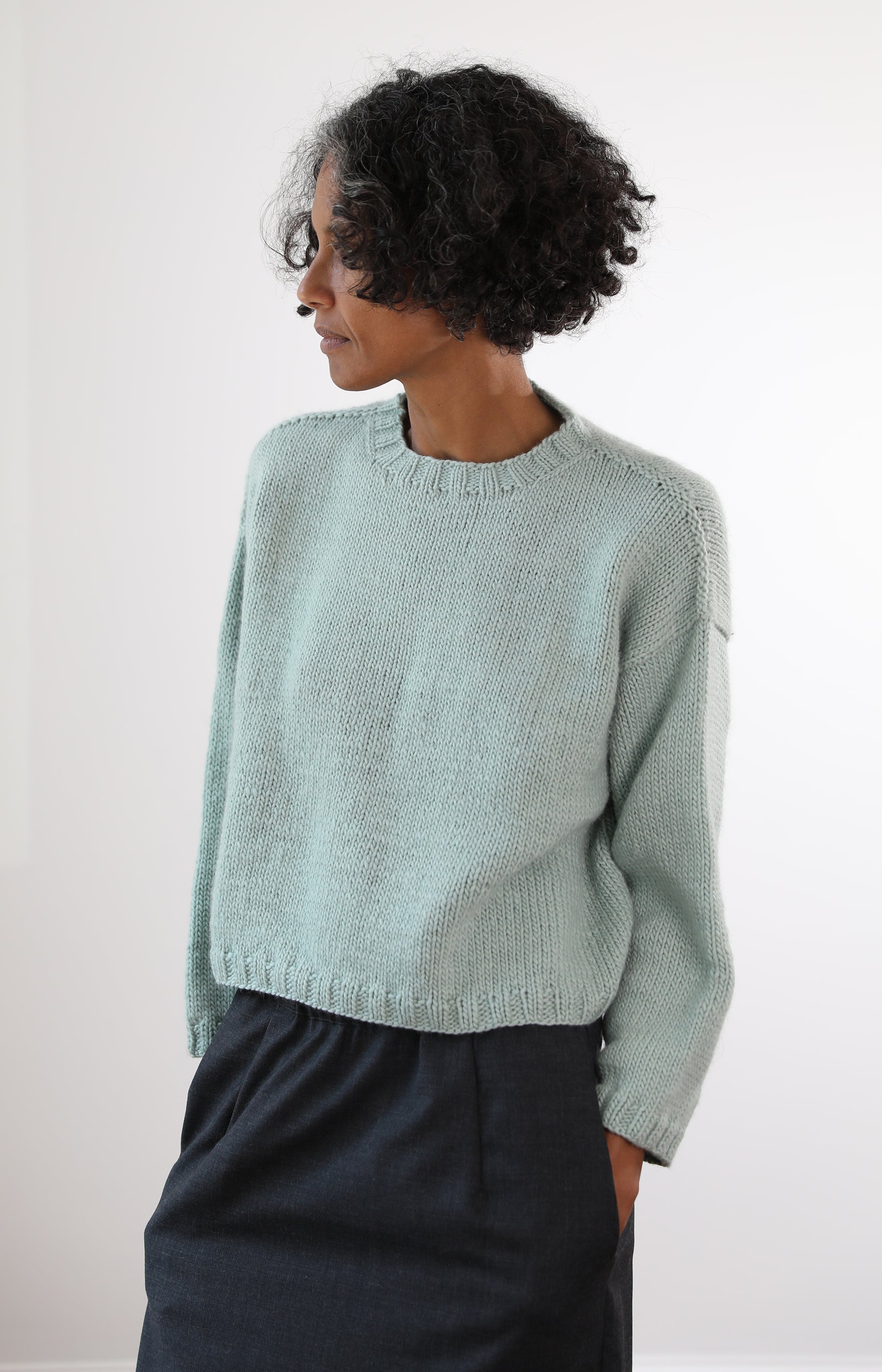 Nitto mint green Italian merino wool pullover with shrunken fit, dropped shoulders and banded collar, hem and cuffs.