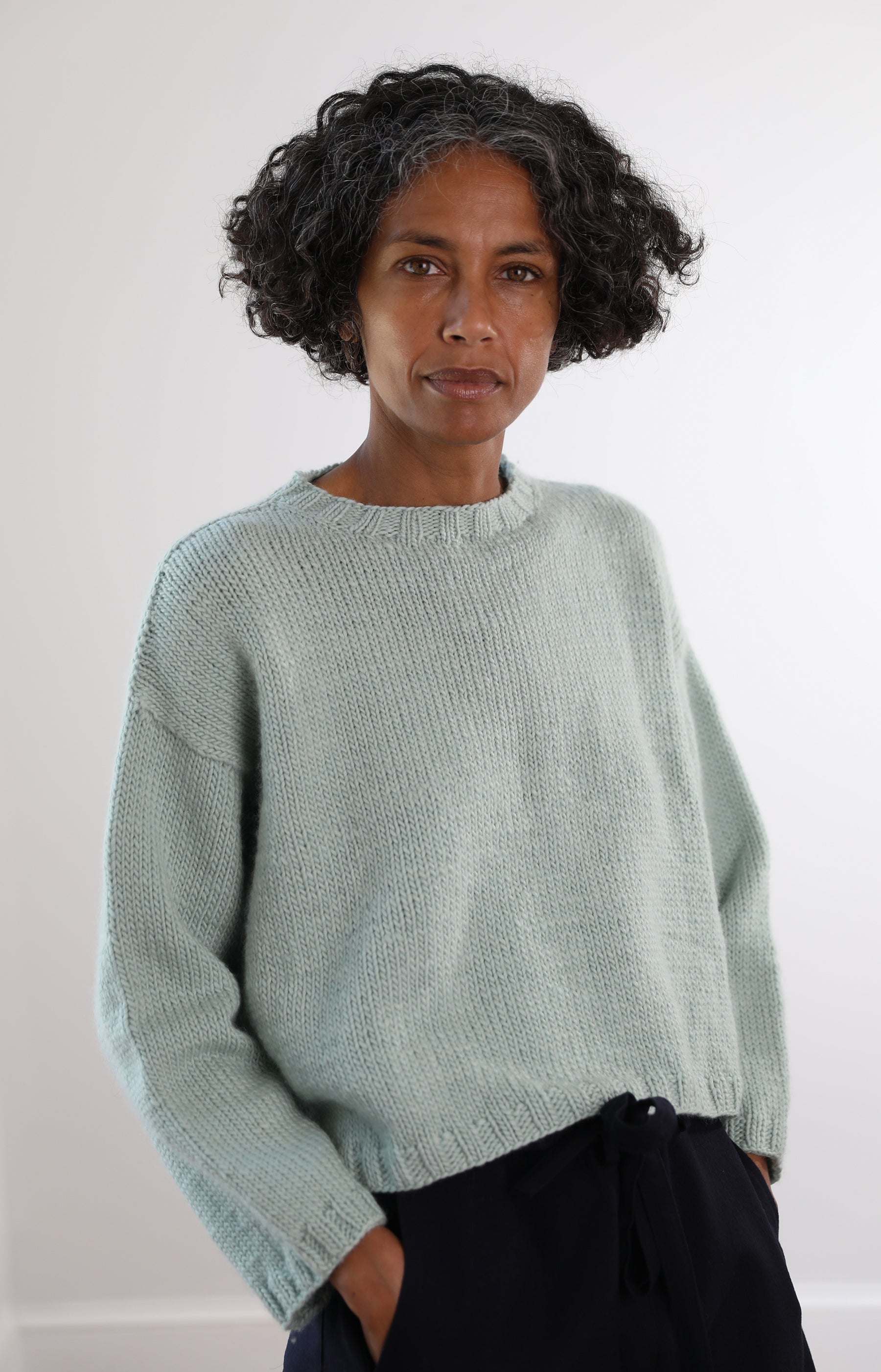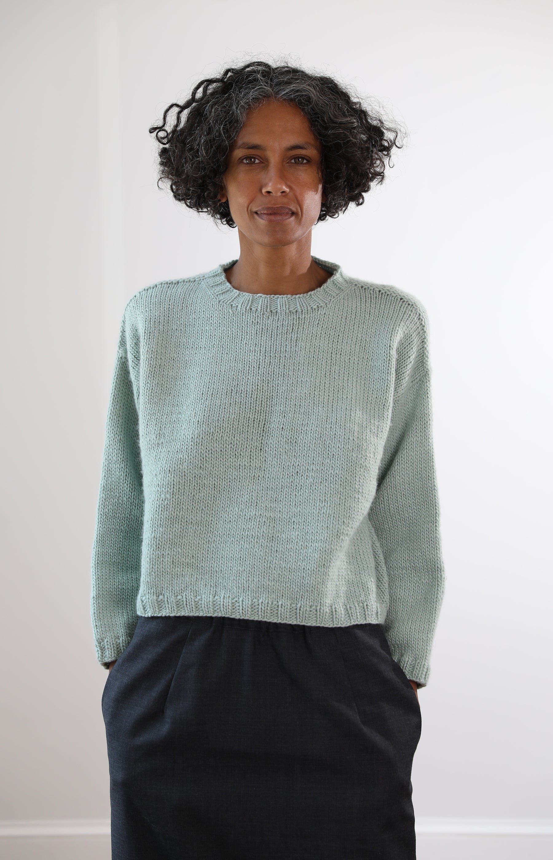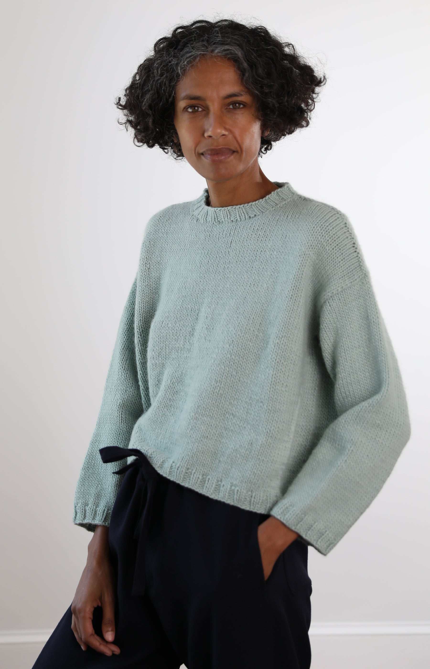 Nitto mint green Italian merino wool pullover with shrunken fit, dropped shoulders and banded collar, hem and cuffs.