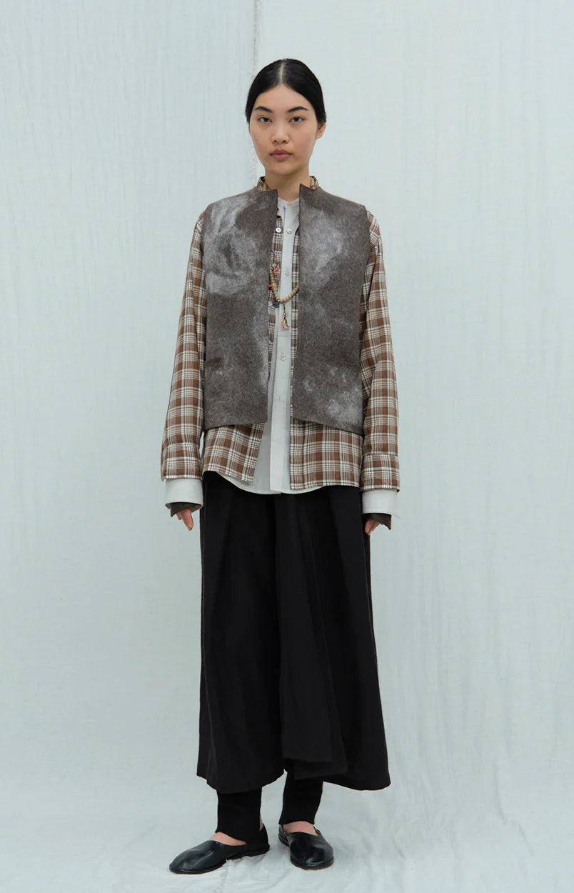 Norlha melange felt vest. This vest is raw-felted and moulded using a zero-waste process, demonstrating remarkable craftsmanship and skill. With a seamless construction, it features seamless pockets and a high neck. The irregular melange design combines white and natural grey khullu, the vest’s cloud-like patterns varying from piece to piece, adding to their unique quality.