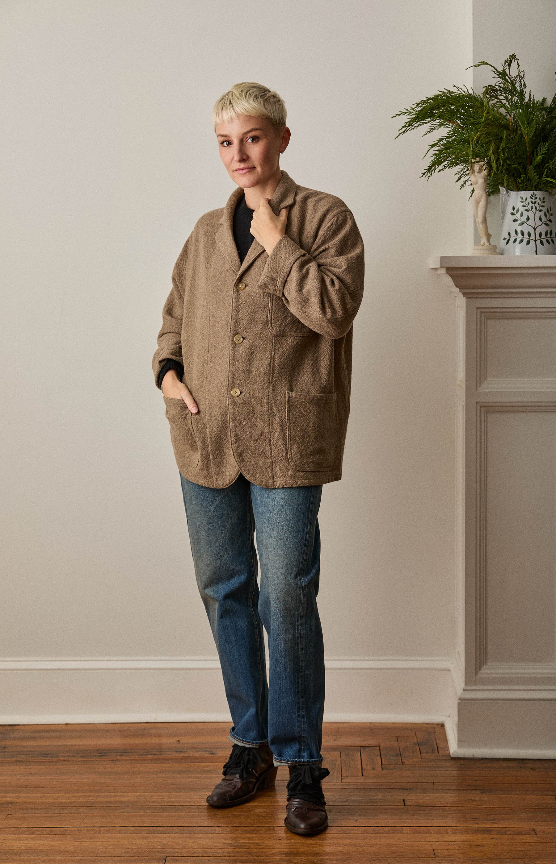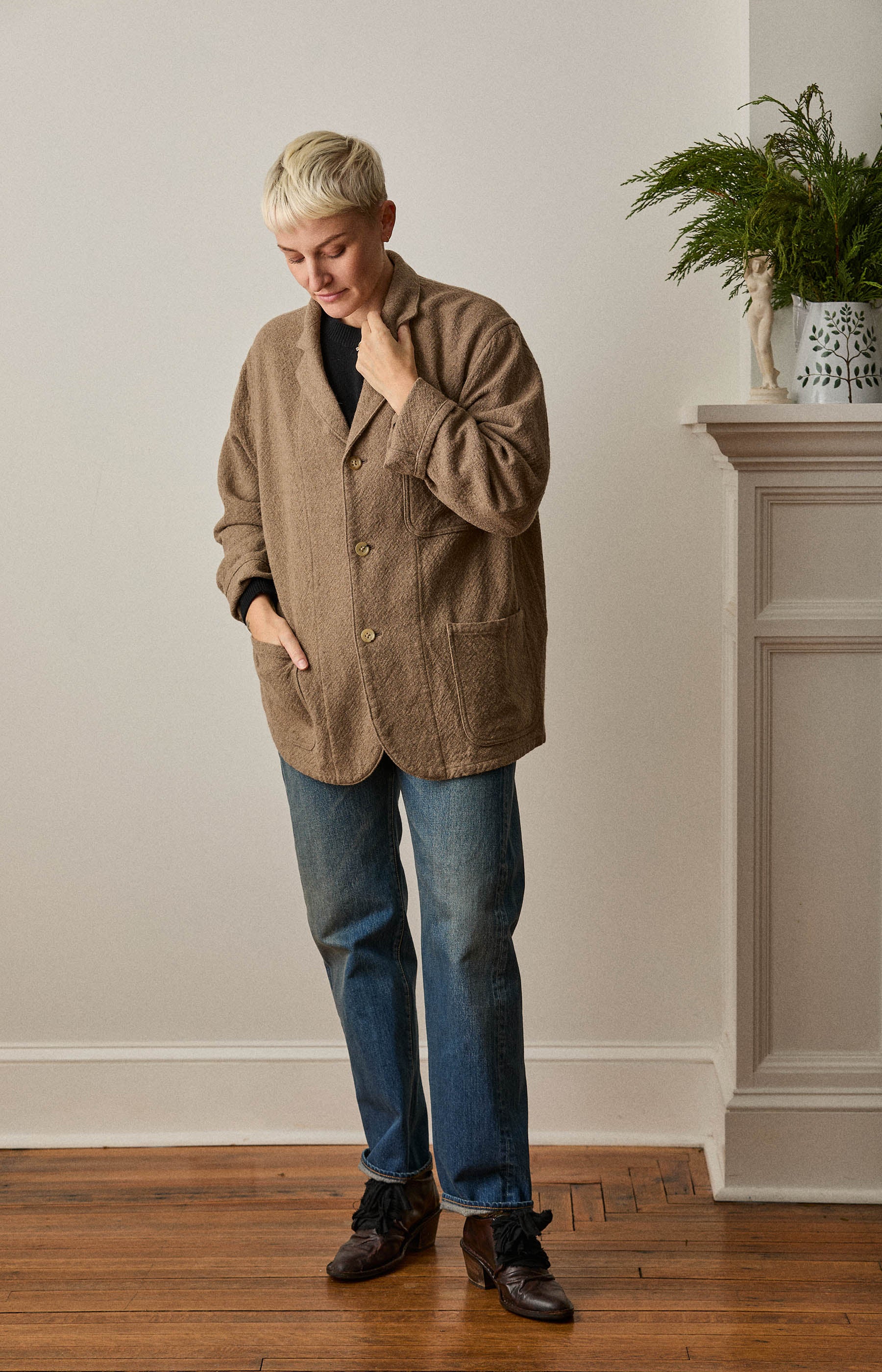 Herill jacket made from tightly woven natural cashmere with button front, front pockets, v-neck, single chest pocket and slightly dropped shoulders.