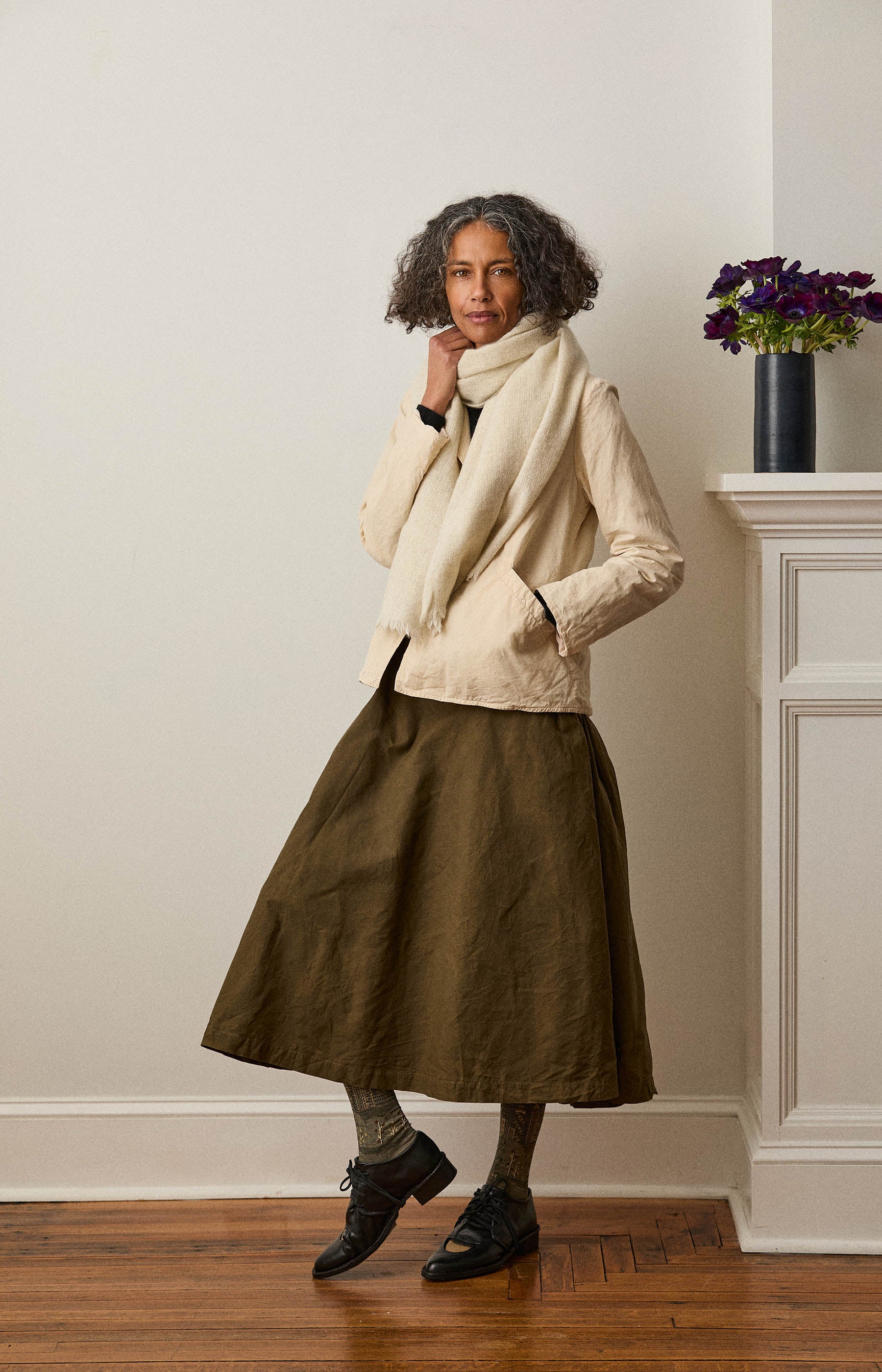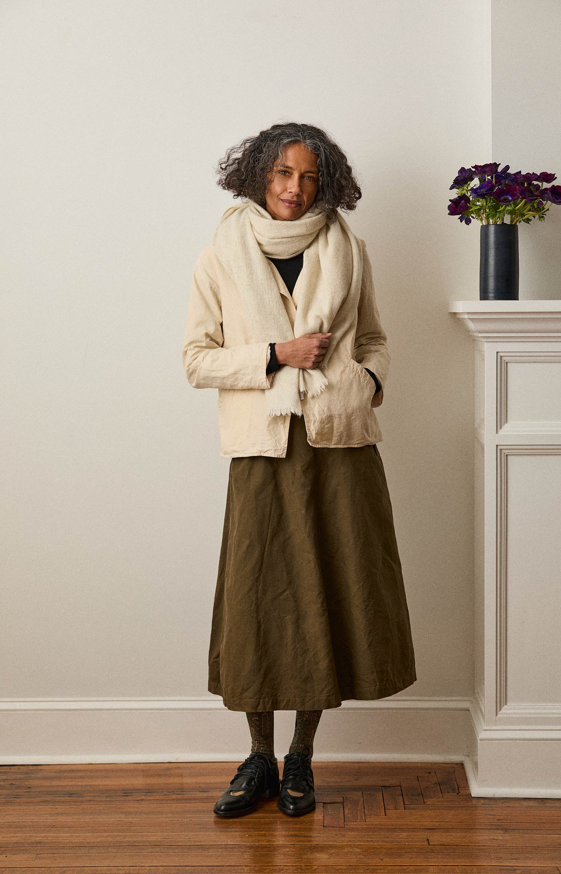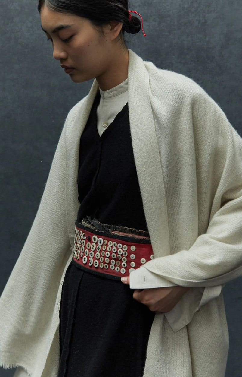 Norlha nomad net scarf in natural yak white. This intensely soft oversized scarf is woven from 100% yak khullu. Its loose weave was developed by a master weaver using only two of the four pedals on the loom. This scarf’s naturally white fibre base is entirely unbleached. White yak khullu is exceptionally rare, with only one in every thousand animals possessing an albino coat.