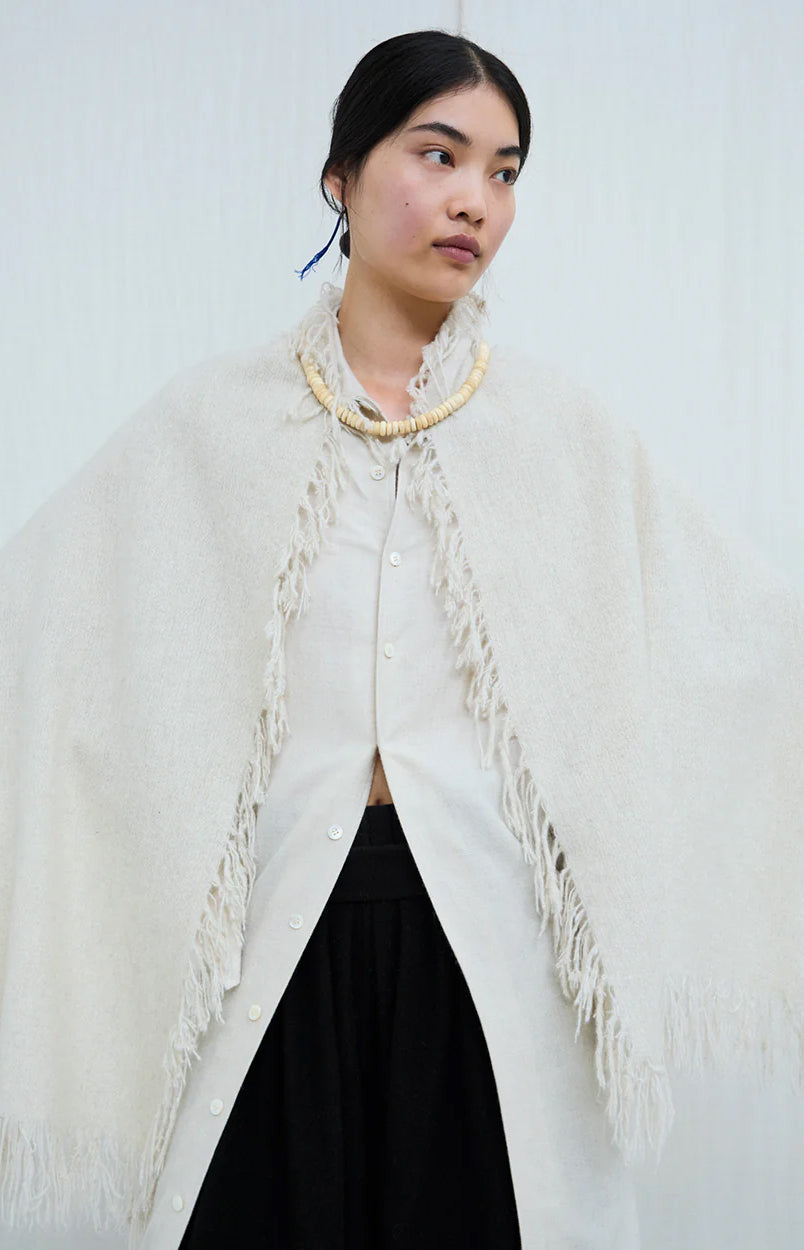 Norlha nomad net crest scarf in natural yak white. This intensely soft scarf is woven from 100% yak khullu. Its loose weave was developed by our master weaver using only two of the four pedals on the loom. This scarf’s naturally white fibre base is entirely unbleached. It features raw fringing along its four sides.