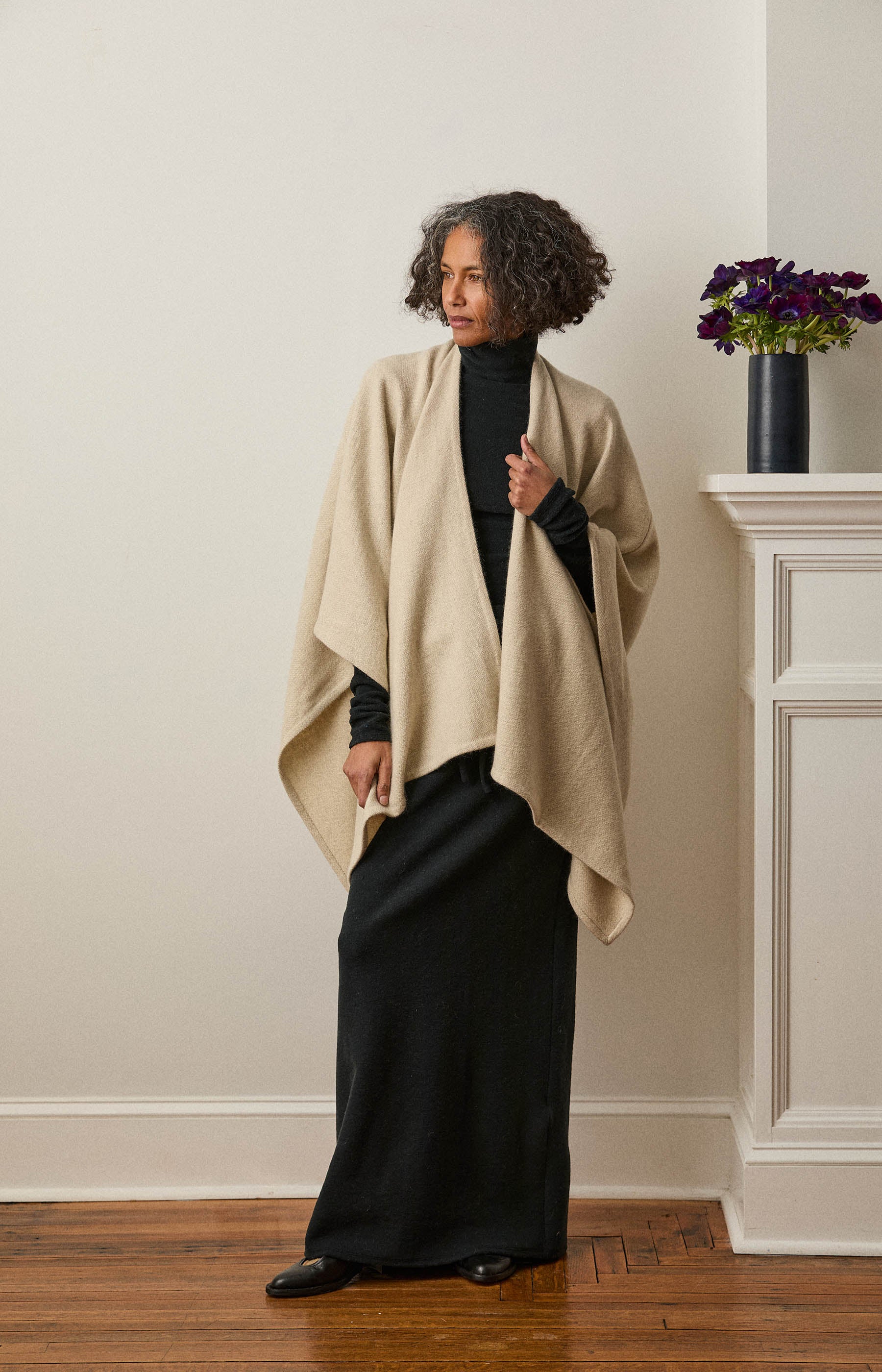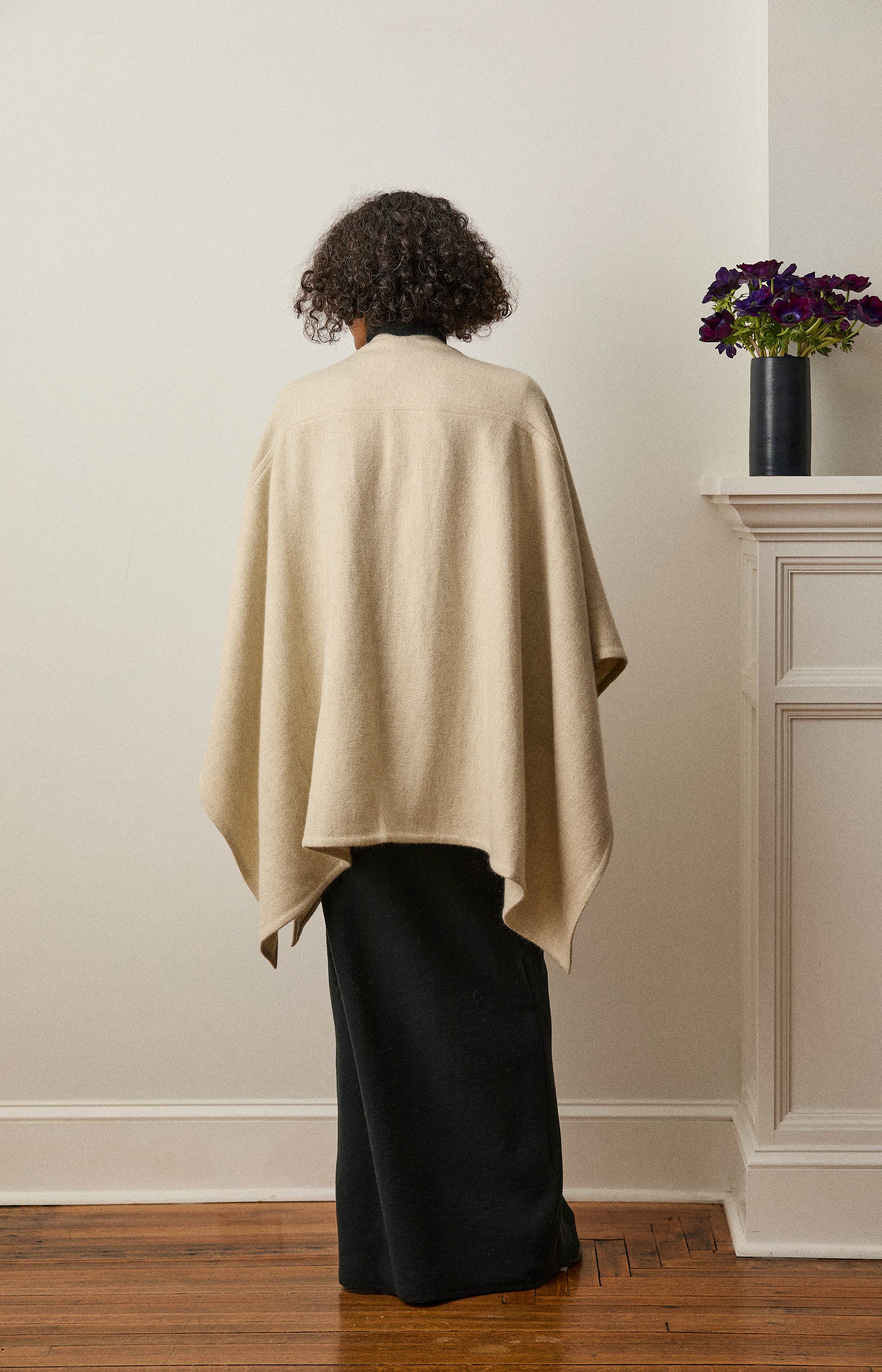 Norlha seamed cape in natural yak white. This pure yak down open-front cape is refined and luxurious with a cropped cut for versatile, easy wear. It features a structural welt seam lining the back of the shoulders and arms and a hand-stitched welt turnover at the hem.