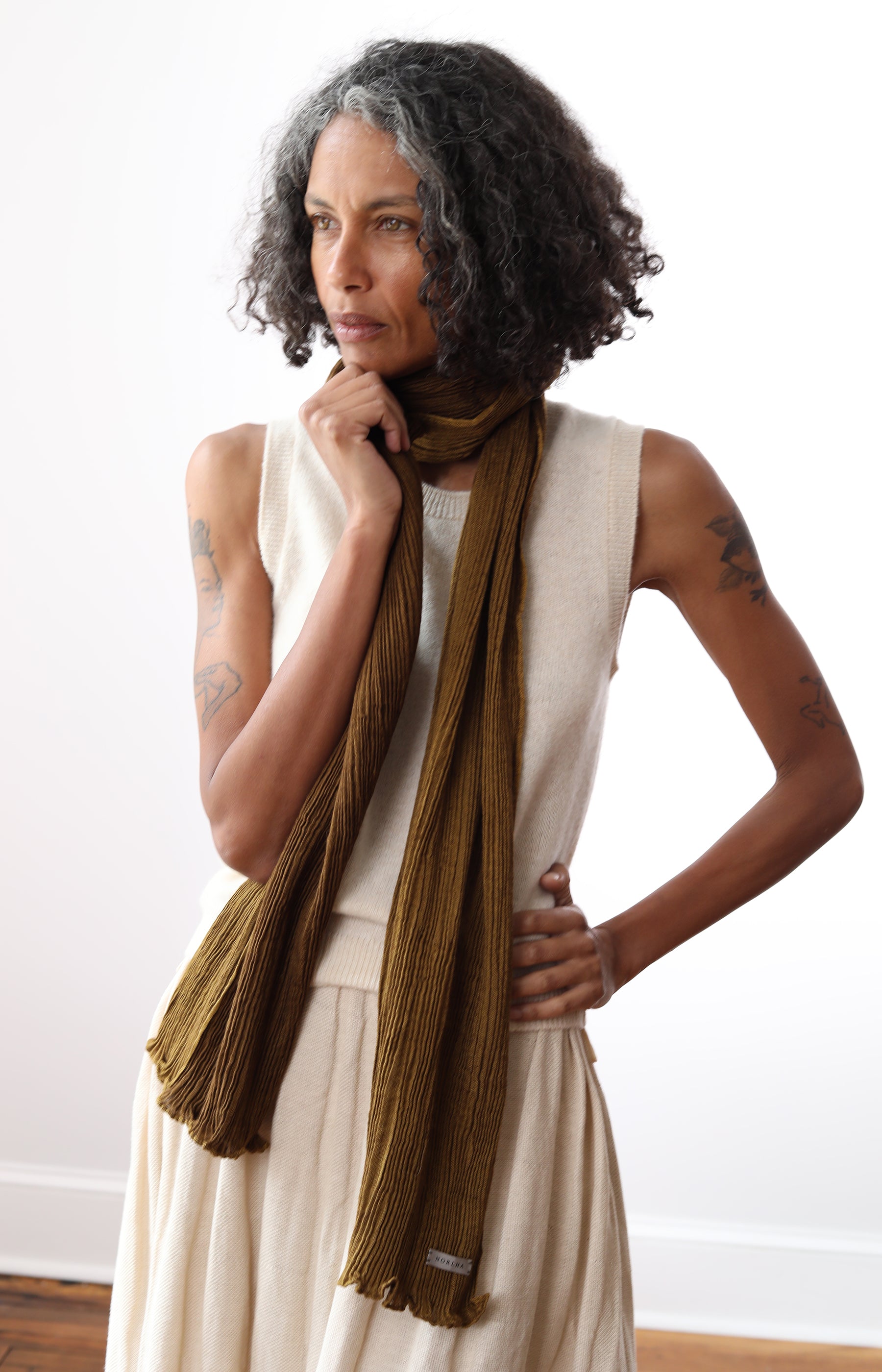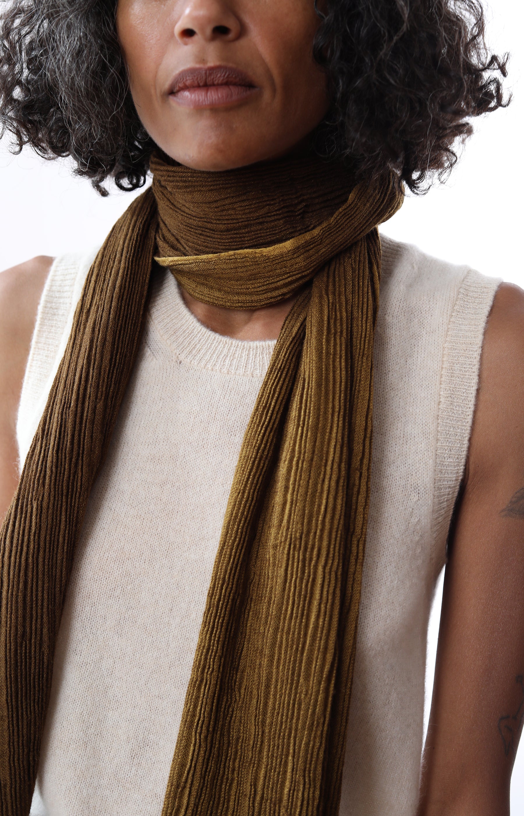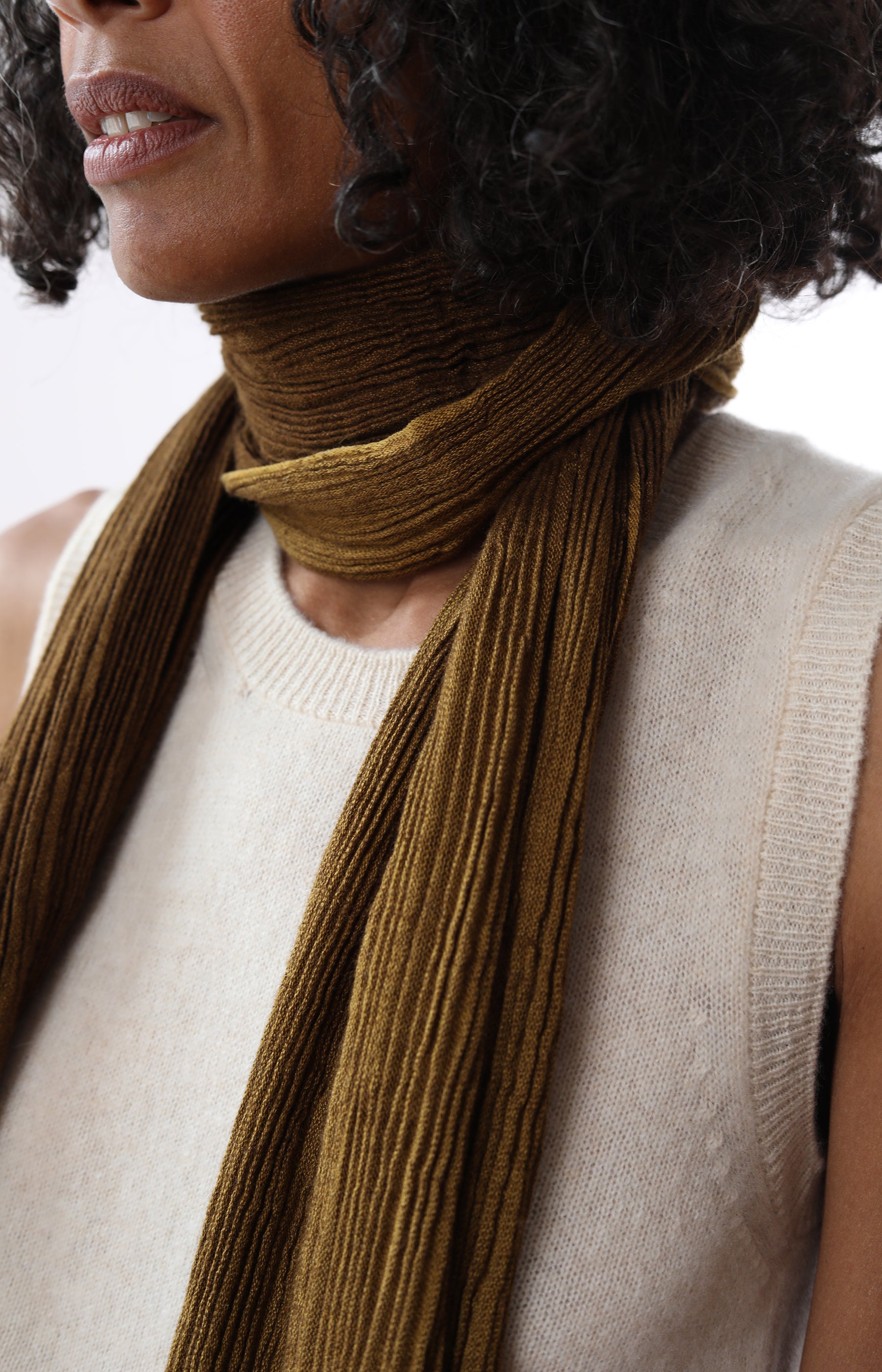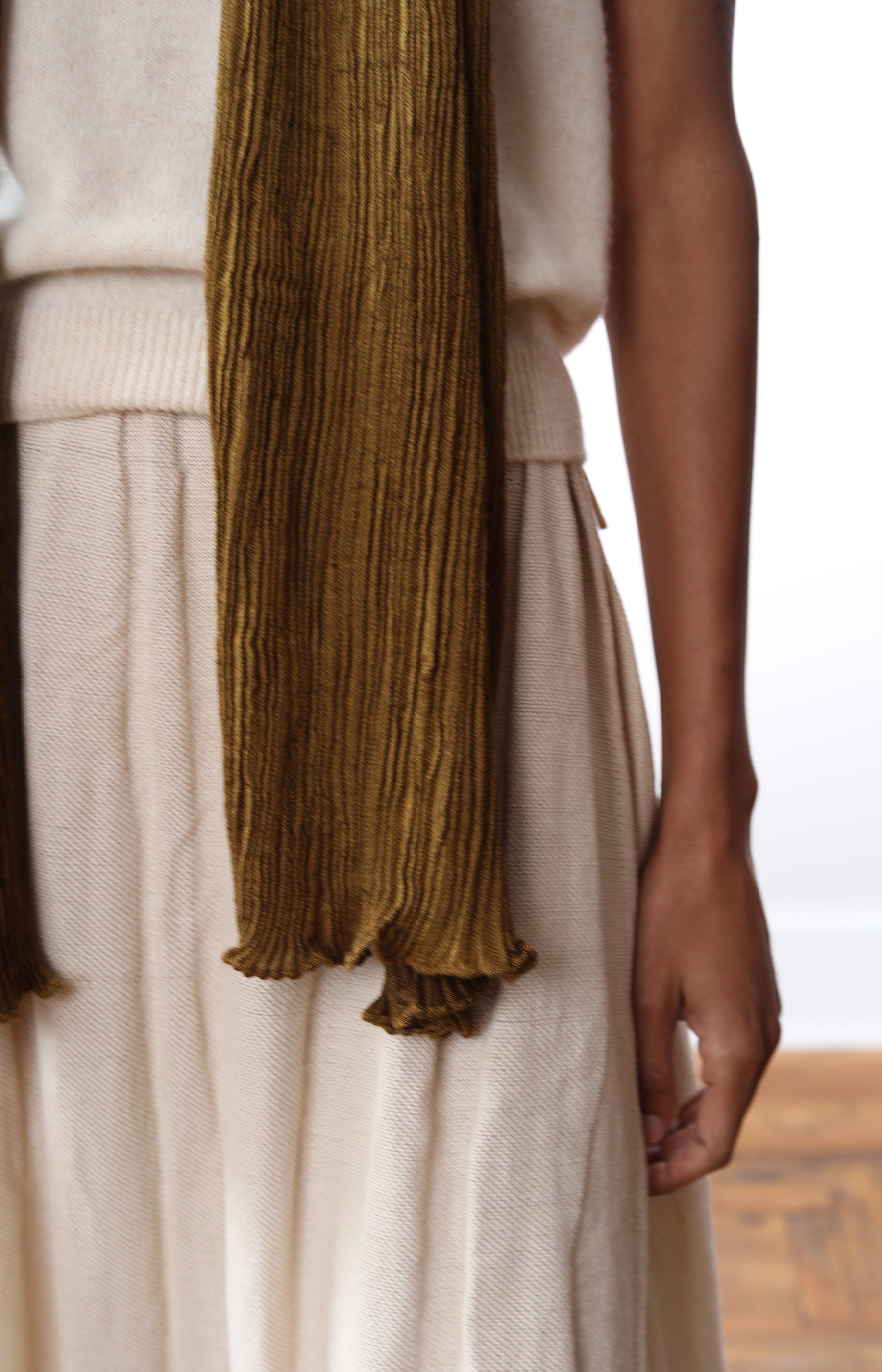 Norlha nutshell Feather Ripples scarf. This lightweight scarf is made from a yak khullu and silk blend, a luxurious combination of fibers that creates a crinkled effect in the fabric. With its narrow width, it can be wrapped around the neck while keeping a slender profile.