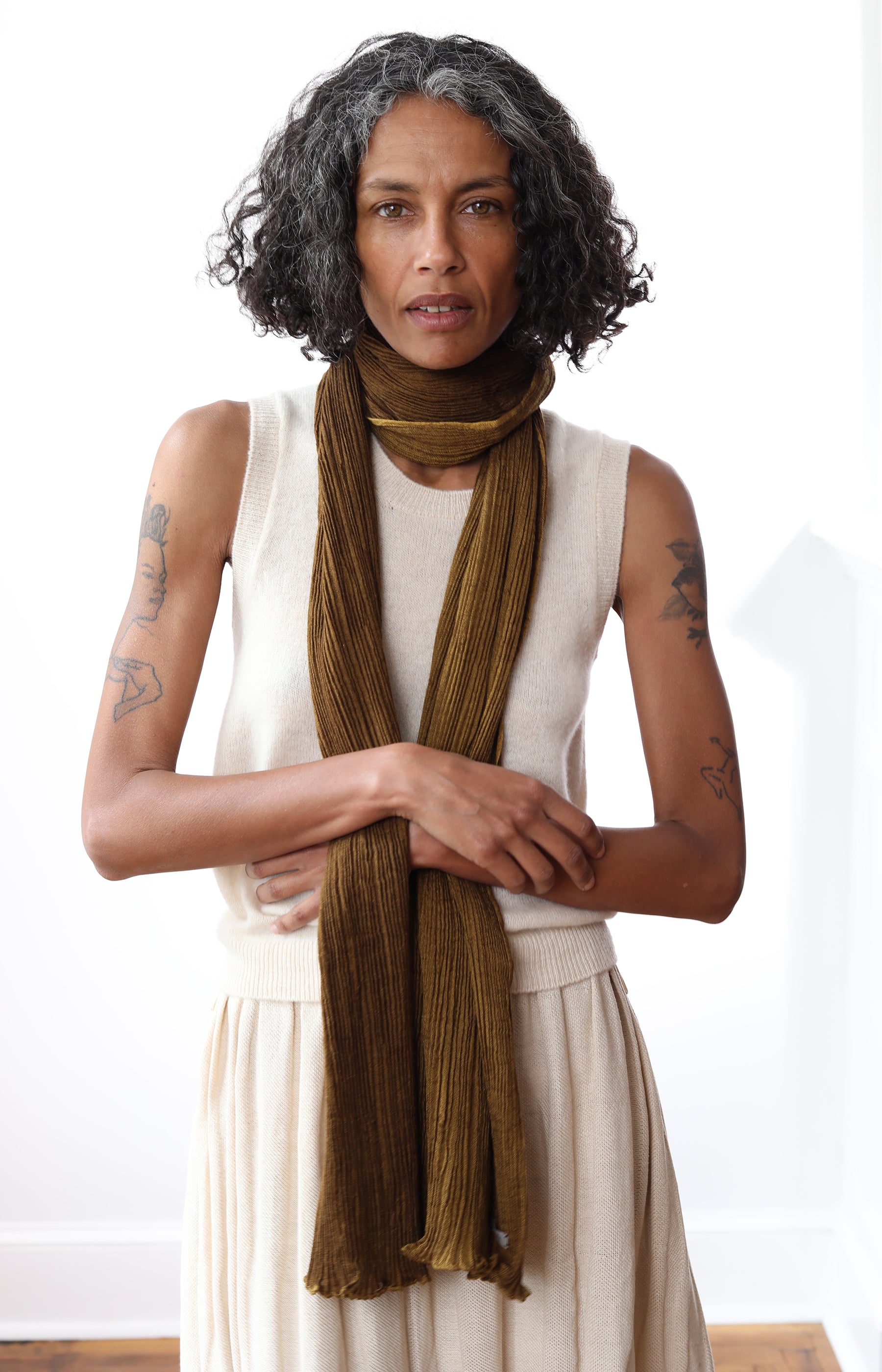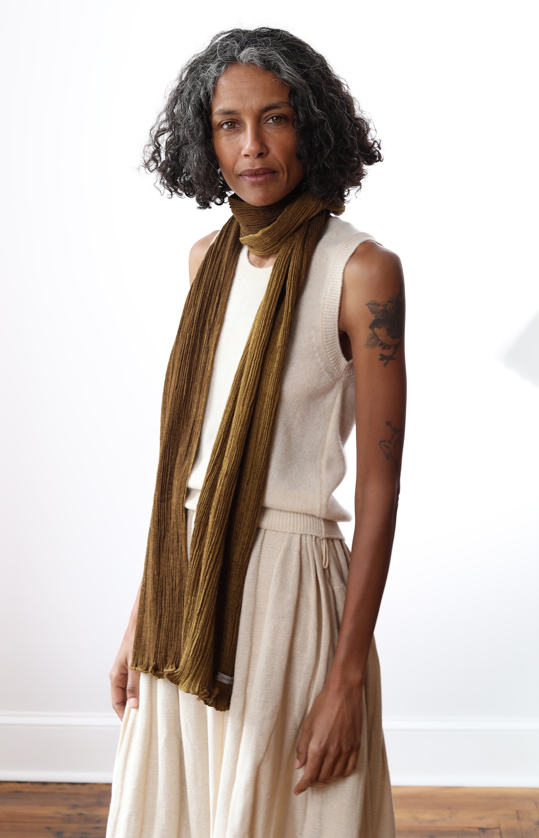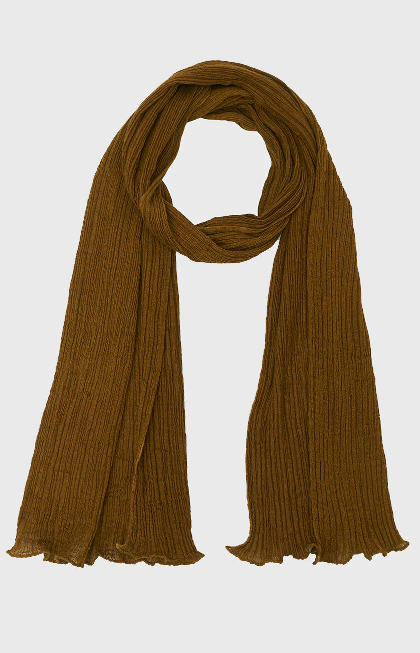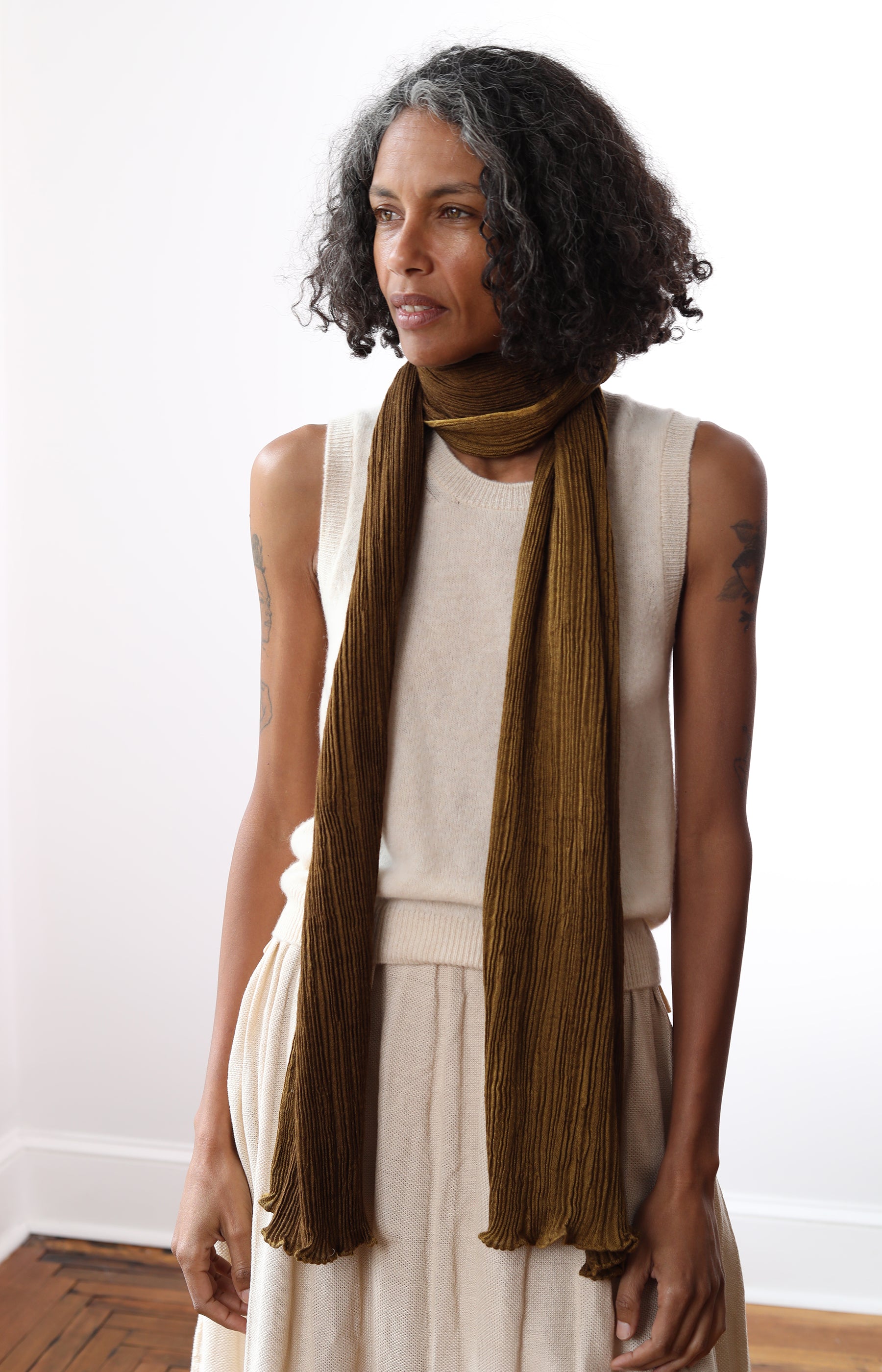 Norlha nutshell Feather Ripples scarf. This lightweight scarf is made from a yak khullu and silk blend, a luxurious combination of fibers that creates a crinkled effect in the fabric. With its narrow width, it can be wrapped around the neck while keeping a slender profile.