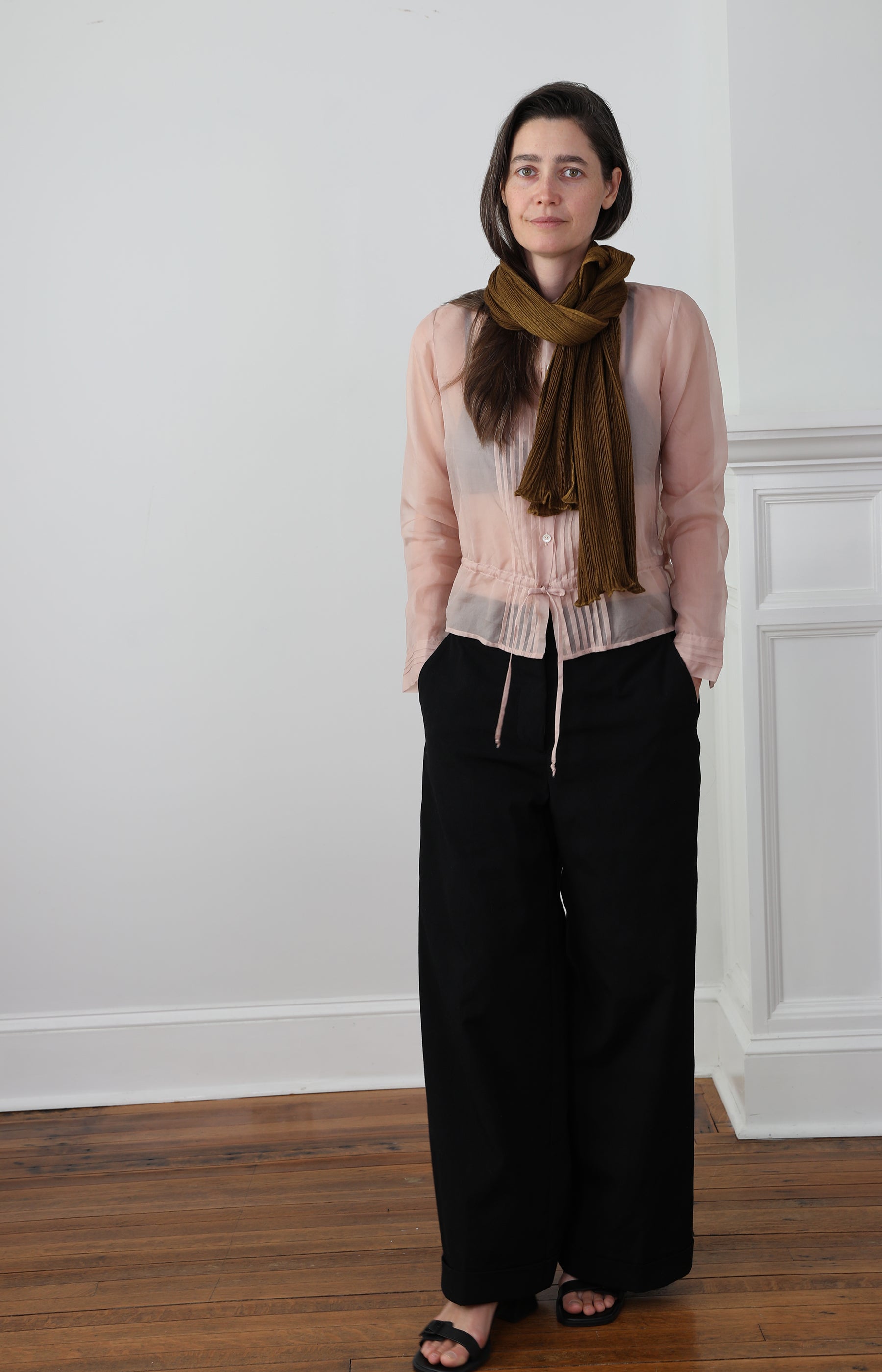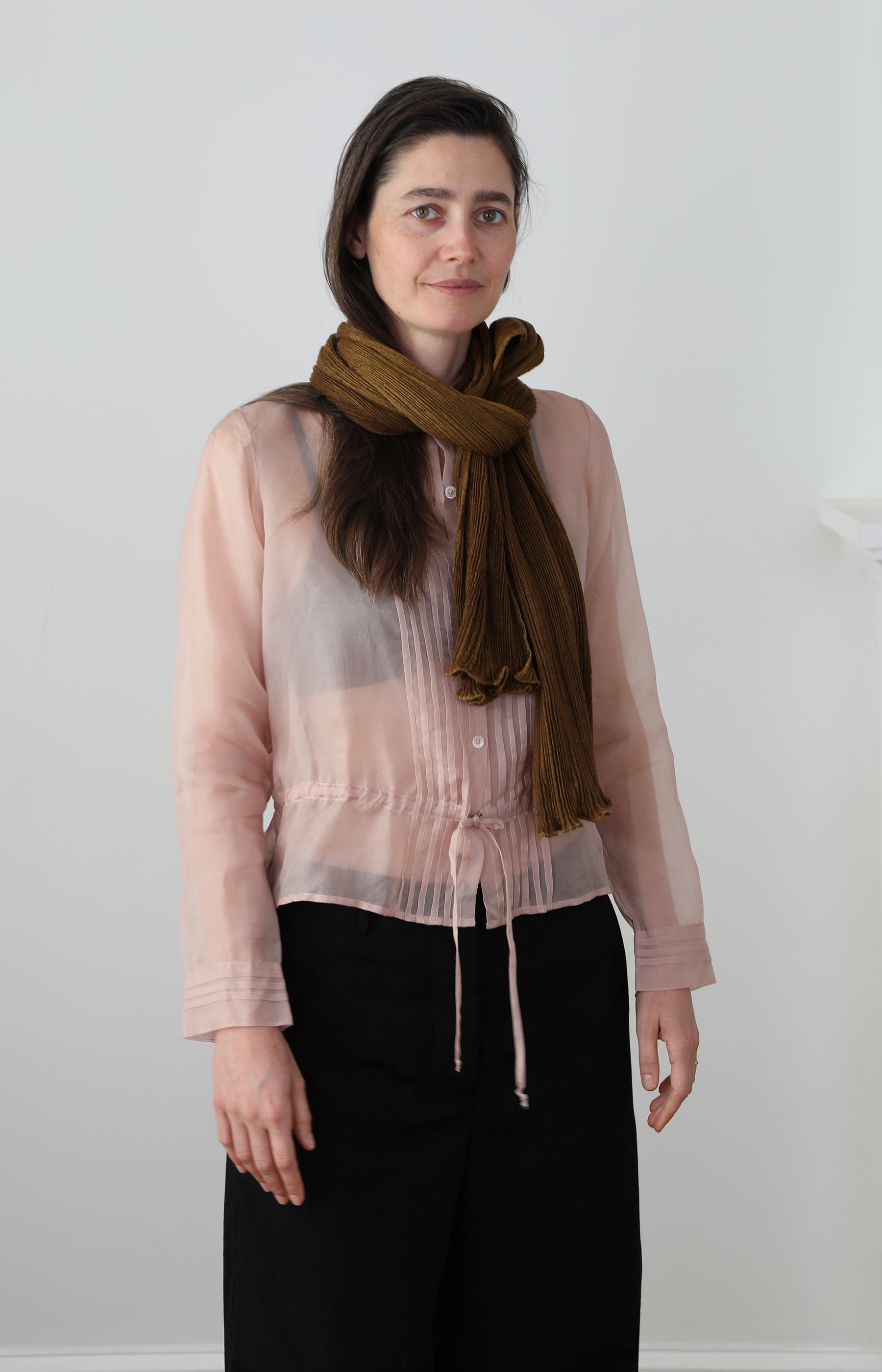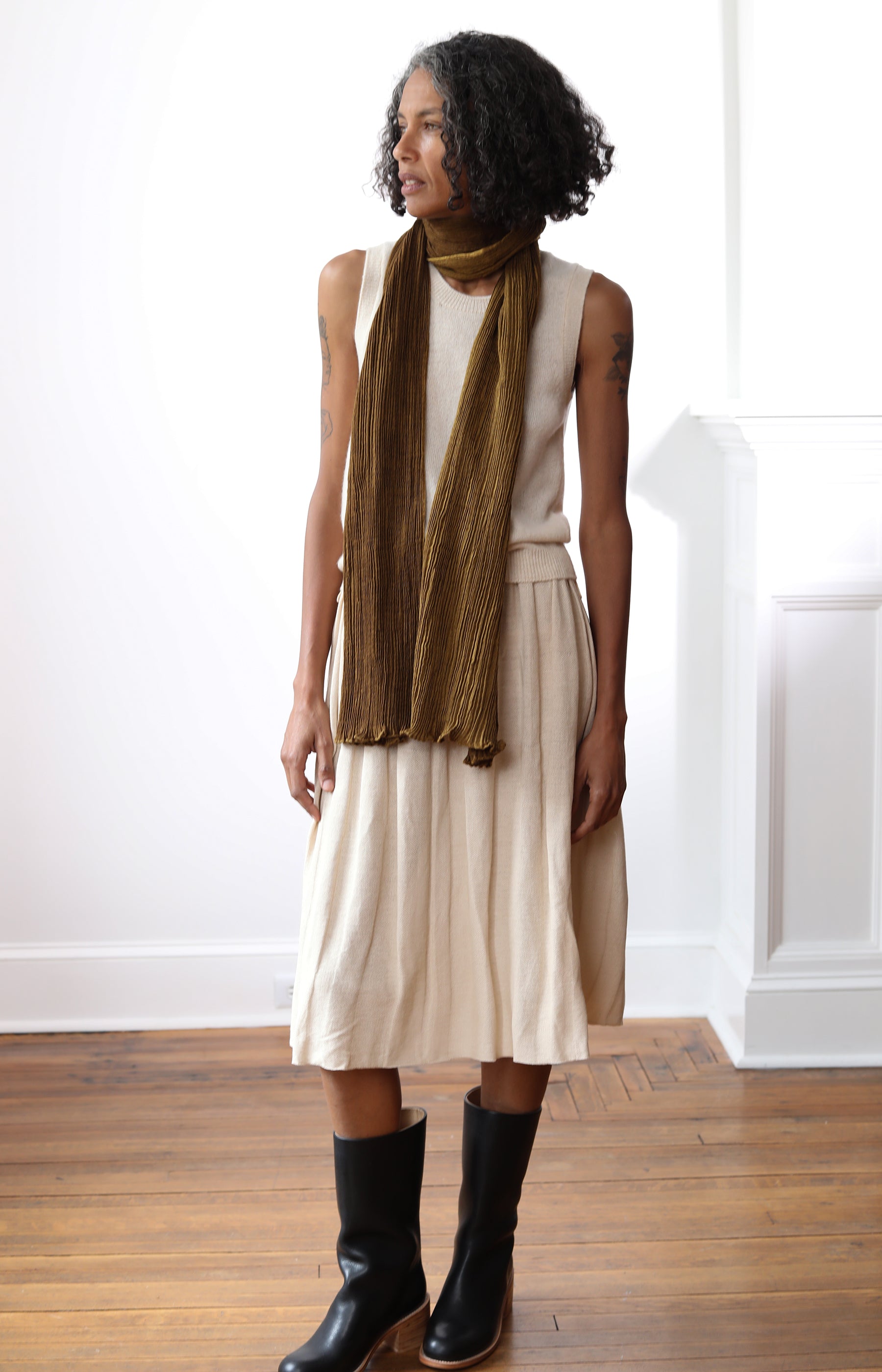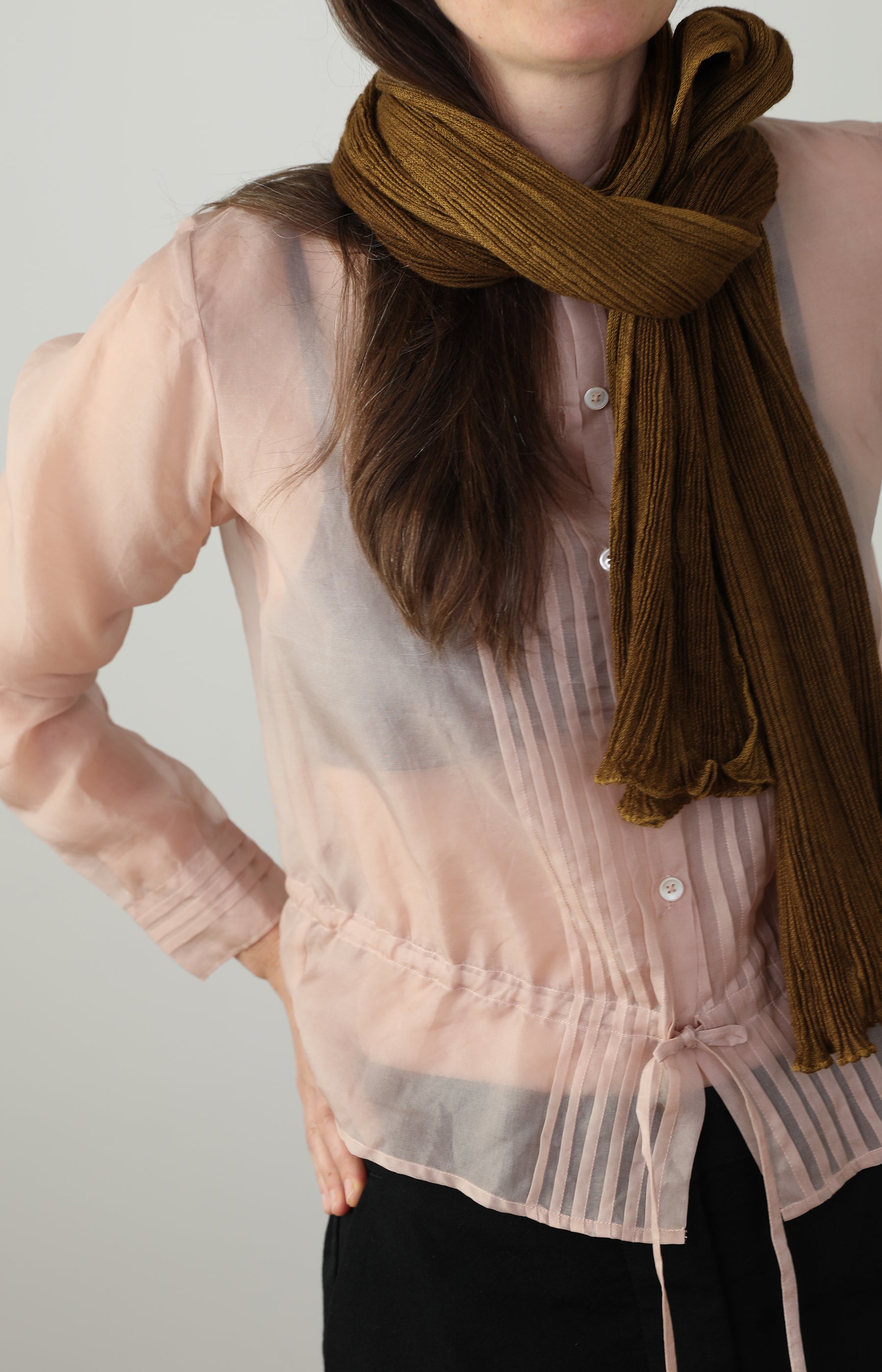Norlha nutshell Feather Ripples scarf. This lightweight scarf is made from a yak khullu and silk blend, a luxurious combination of fibers that creates a crinkled effect in the fabric. With its narrow width, it can be wrapped around the neck while keeping a slender profile.