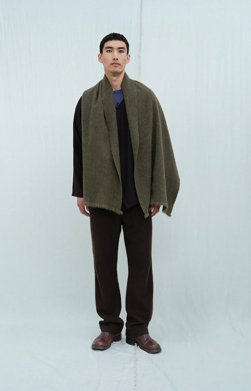 Norlha nomad dense boiled herringbone scarf in olive. An intensely soft 100% yak khullu scarf. The finished fabric is boiled for added density and a fleece-like touch. It features a subtle, herringbone design.