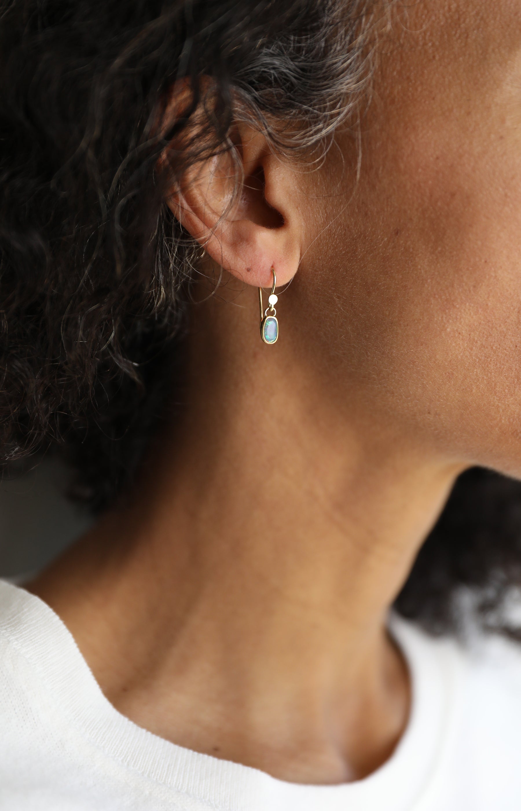 Oval opal drop earrings with 22k gold bezel, hanging from handmade 18k gold ear wires, finished with a hammered coin.