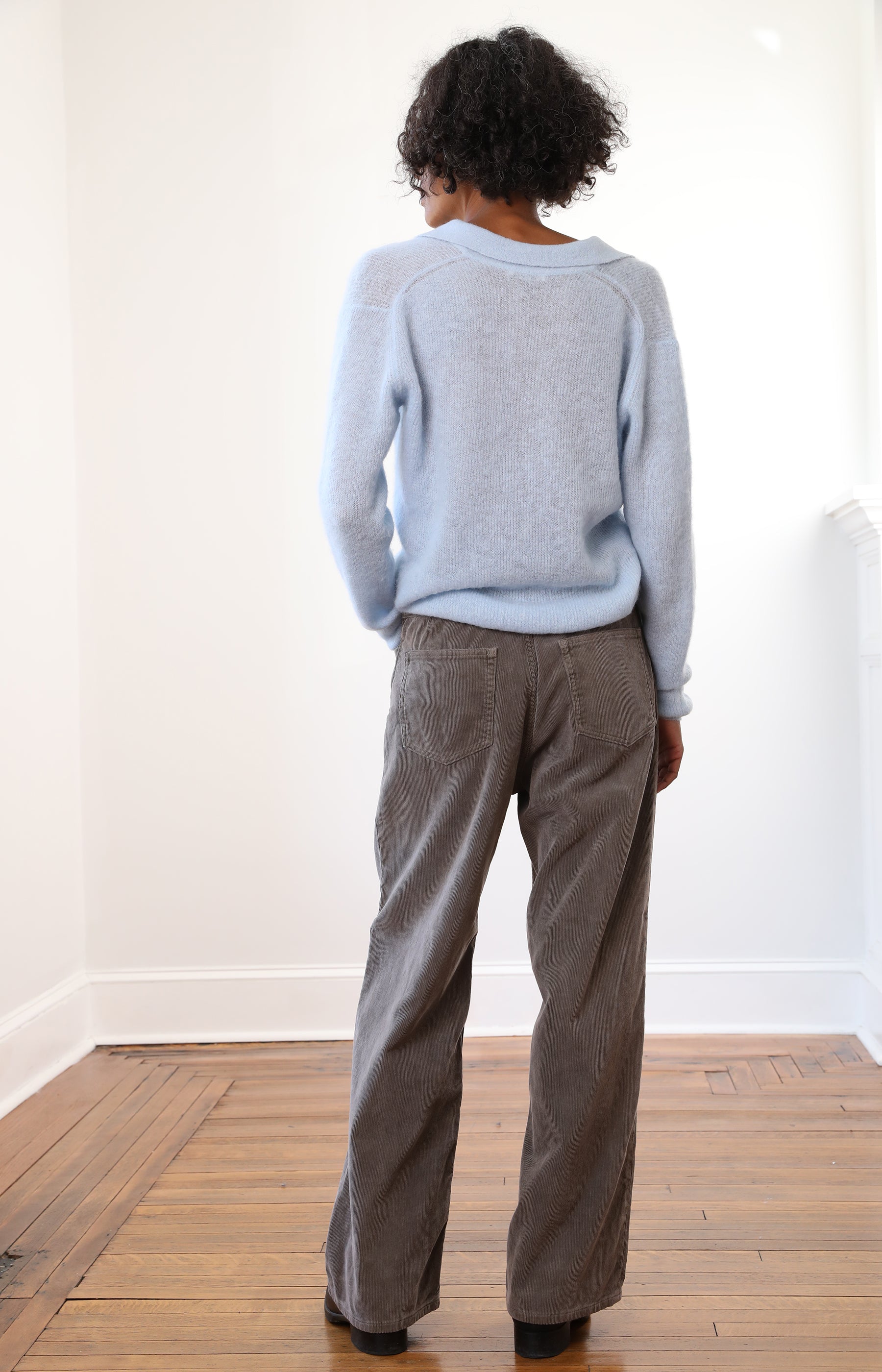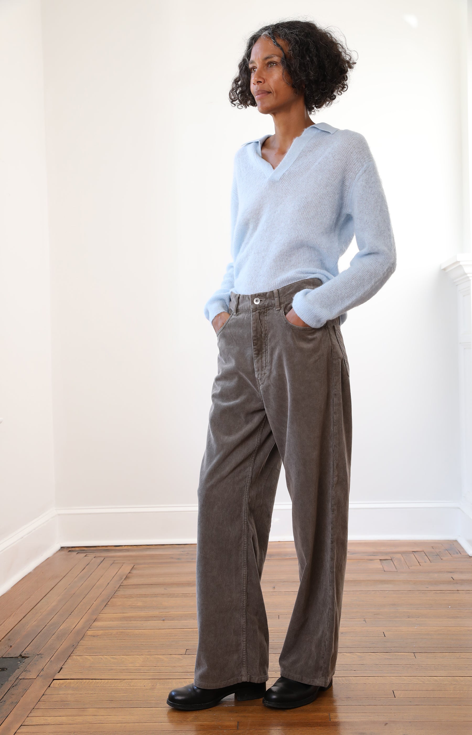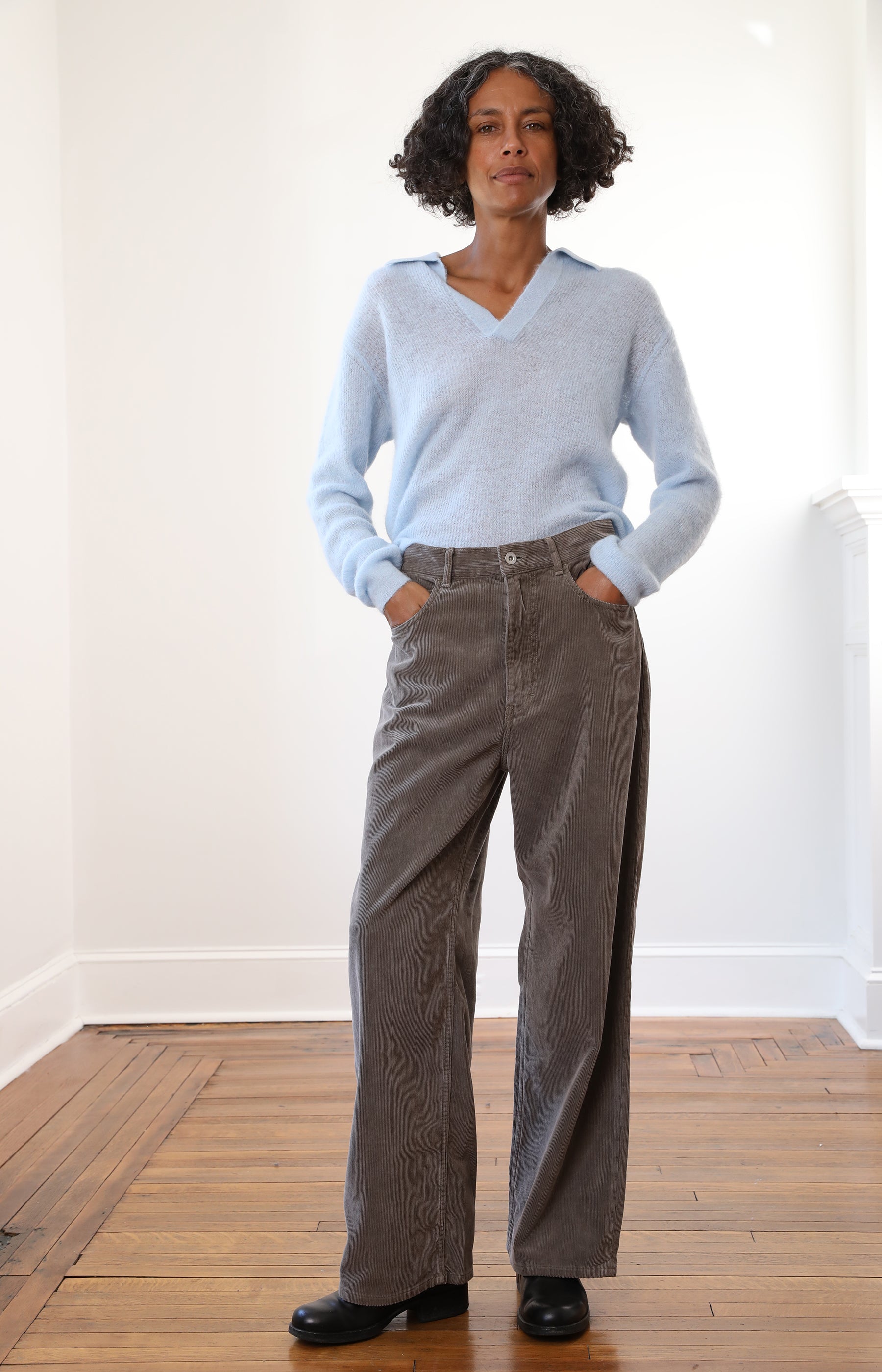Auralee olive brown corduroy pants. Corduroy created from luxurious Egyptian Finx cotton, famous for its exceptional quality. To create a soft, inviting texture, the fabric is carefully beaten and washed, resulting in a smooth, yet rich feel. After sewing, the fabric undergoes a garment dyeing process, enhancing its distinctive appearance and subtle, natural variations. Wide fit with a straight leg.