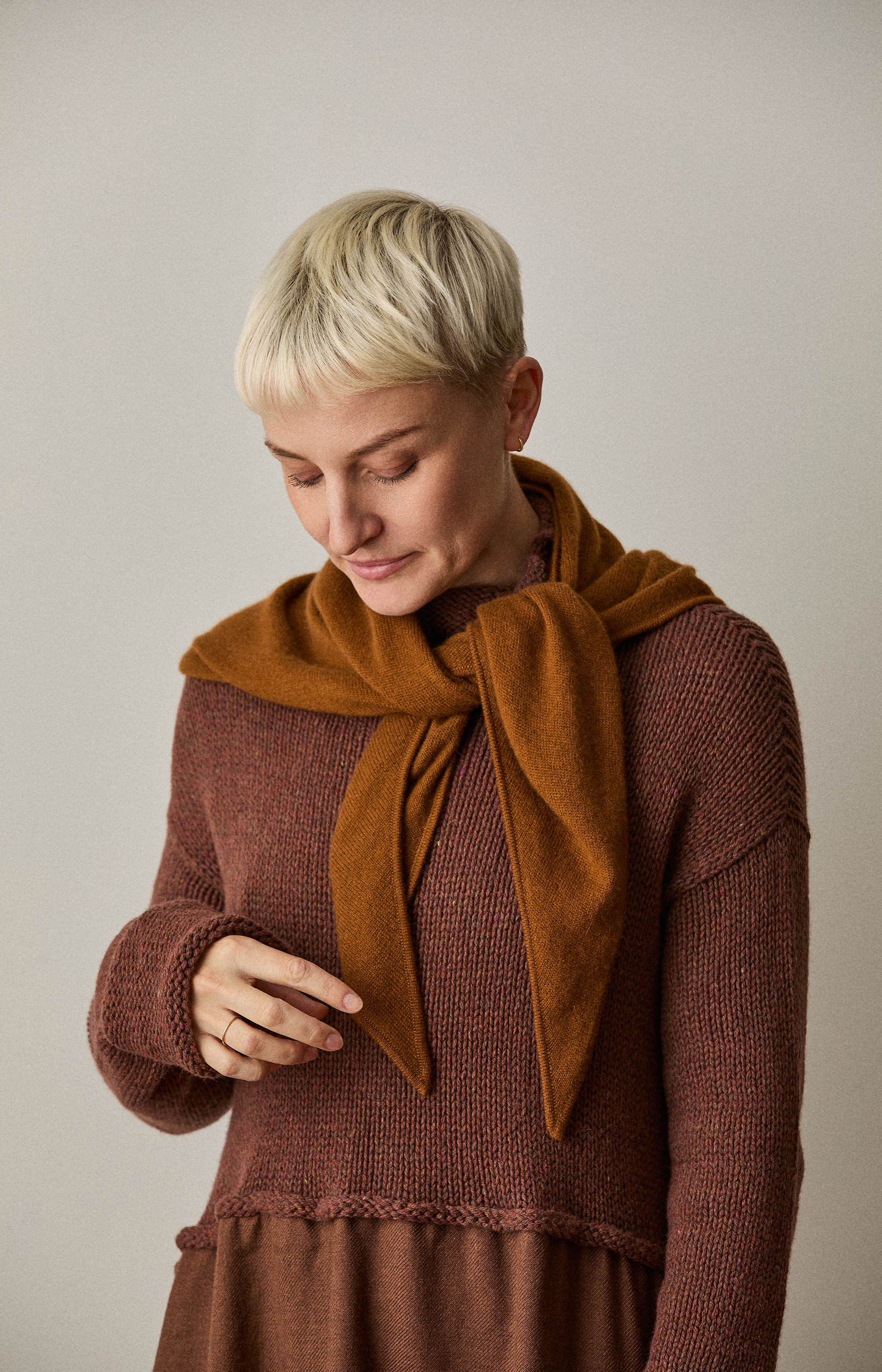 Rust cashmere triangle scarf.