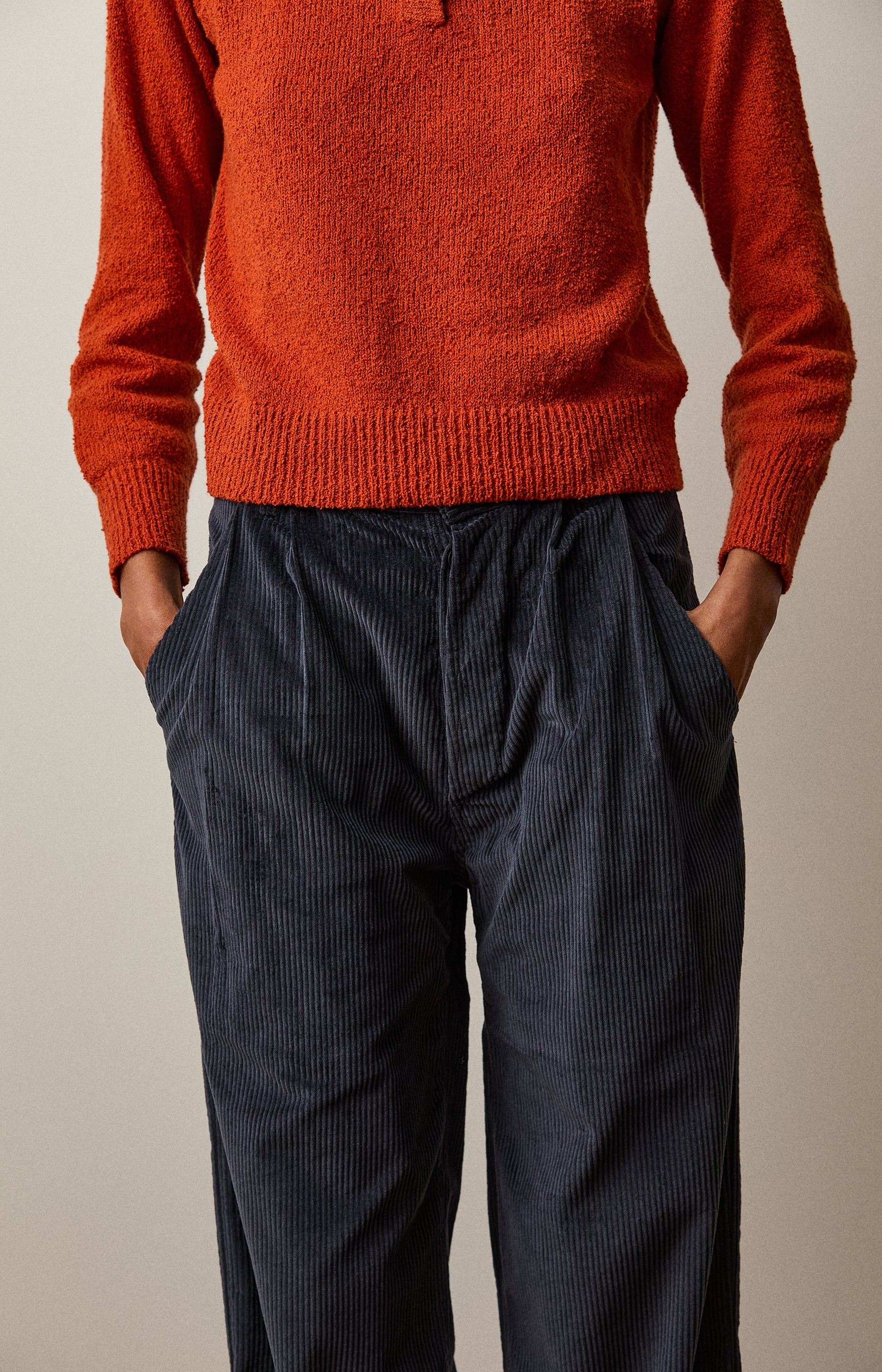 Emma Rothkopf rust ski henley, nspired by Emma's mom’s childhood sweater. Reimagined in a nubby organic cotton yarn with 4 horn buttons. This style is slightly shrunken and has a high arm hole. If you prefer a looser fit, size up.
