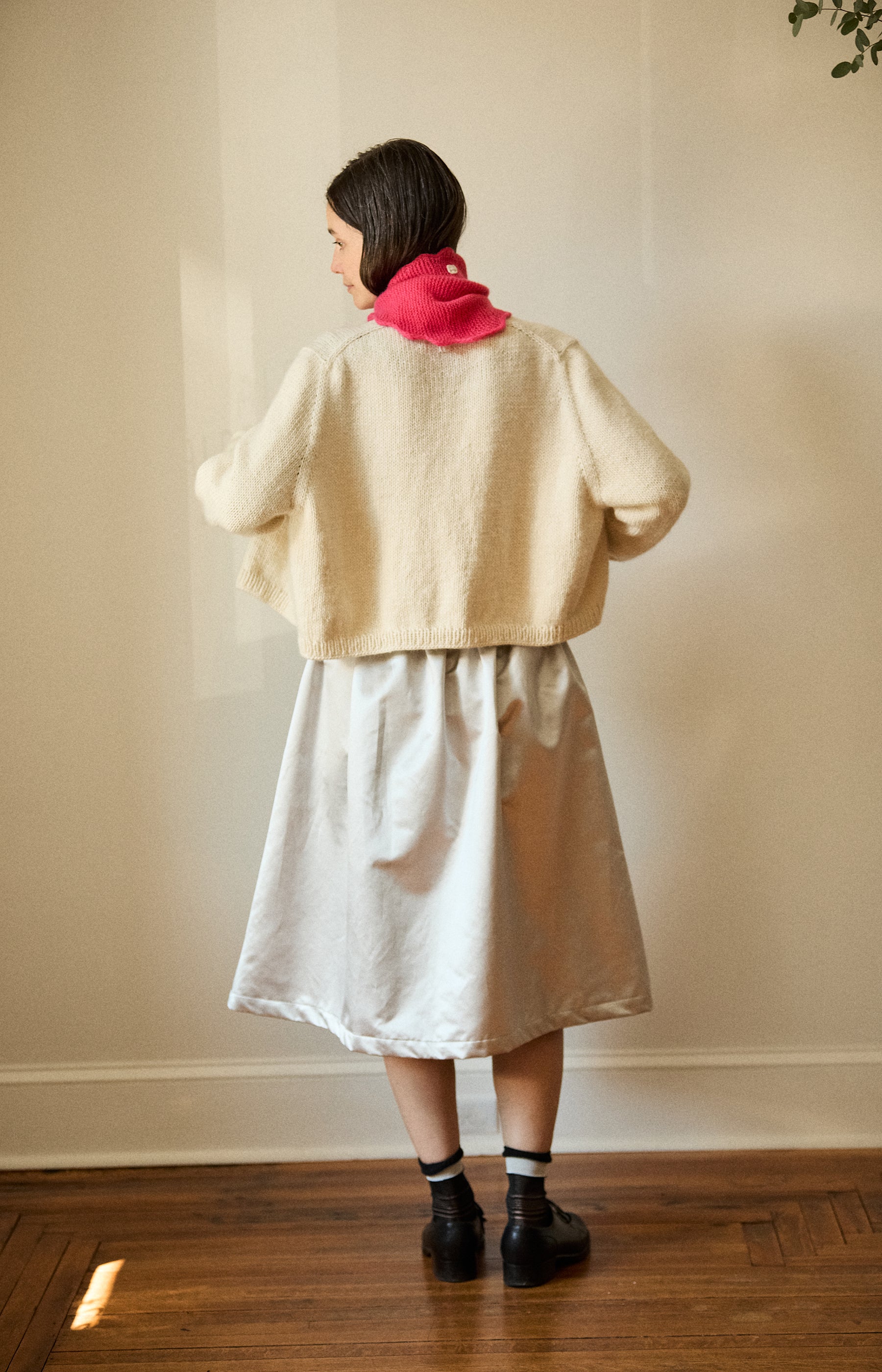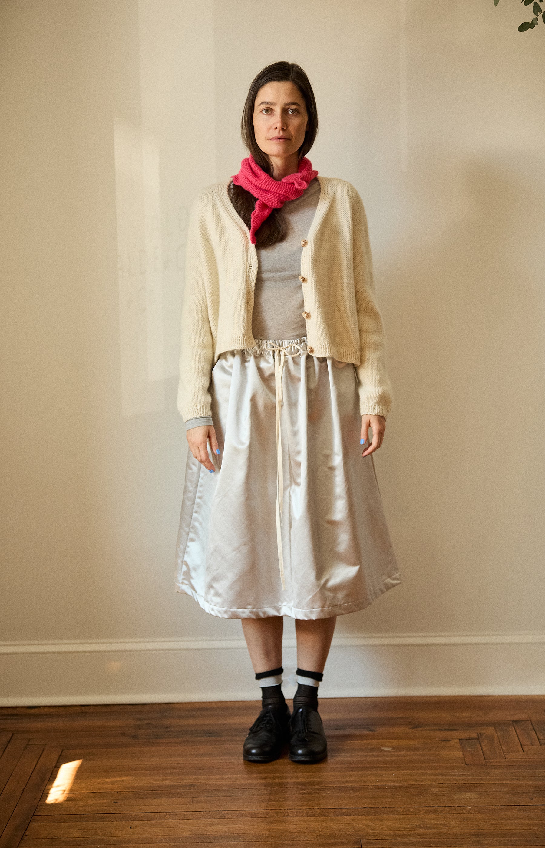 Nitto silver cotton silk thick satin skirt with side pockets and elastic waist with drawstring.