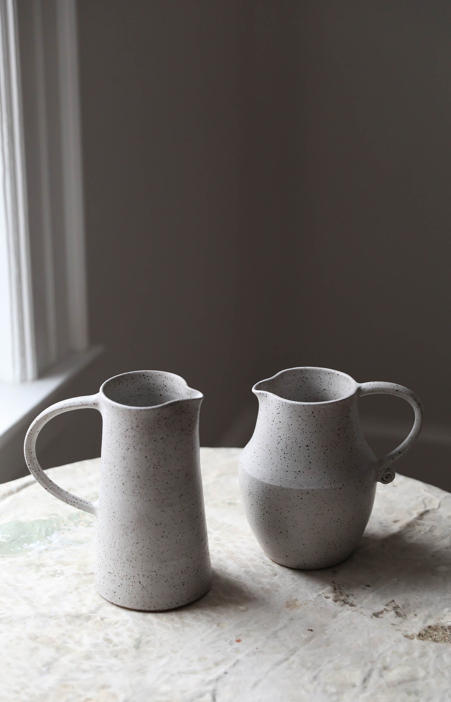 Wheel thrown matte white speckle ceramic pitcher.