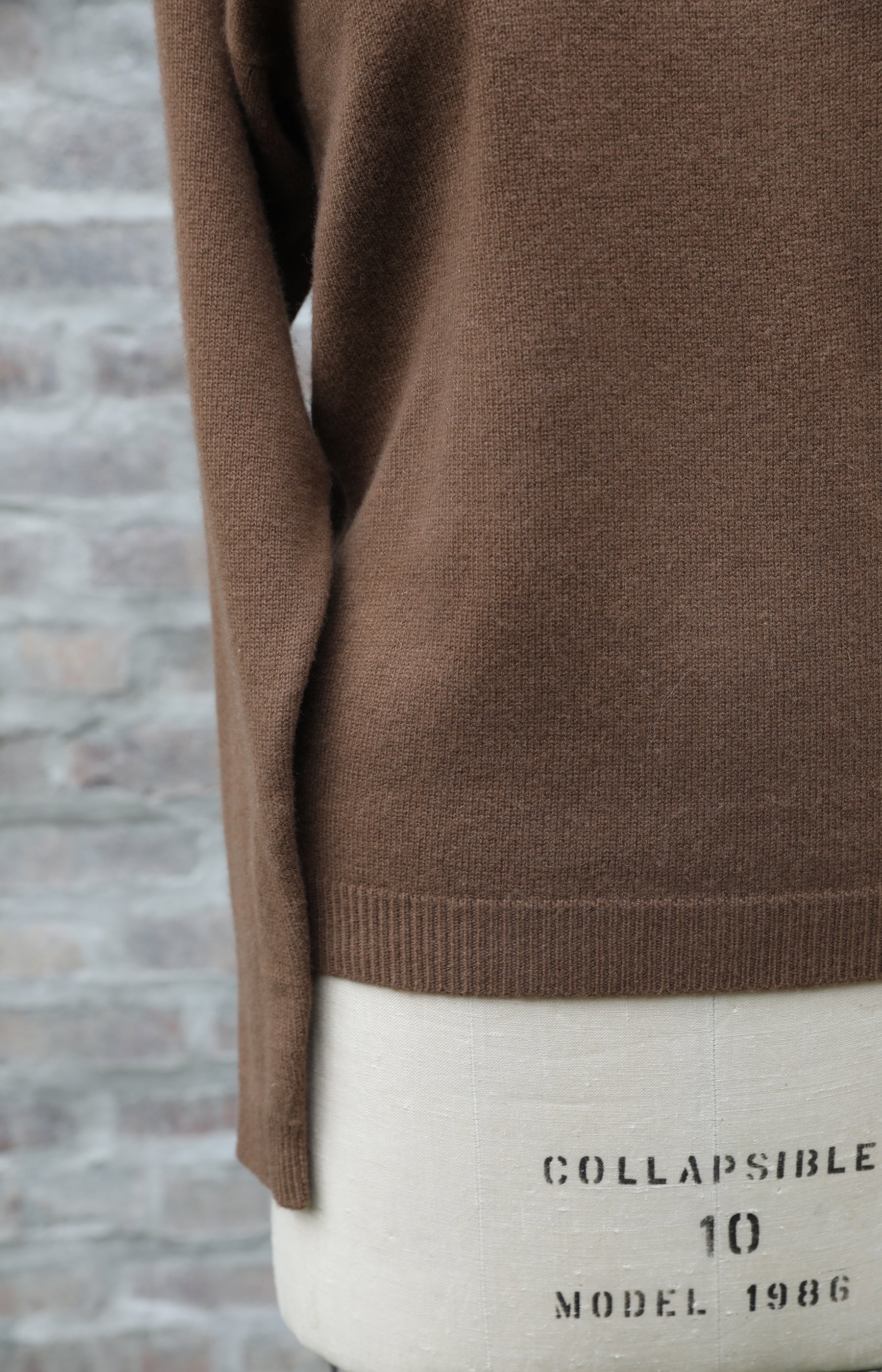 An Irrational Element walnut wool and cashmere pullover with long sleeves, v-neck with collar and ribbed collar, hem and cuffs.