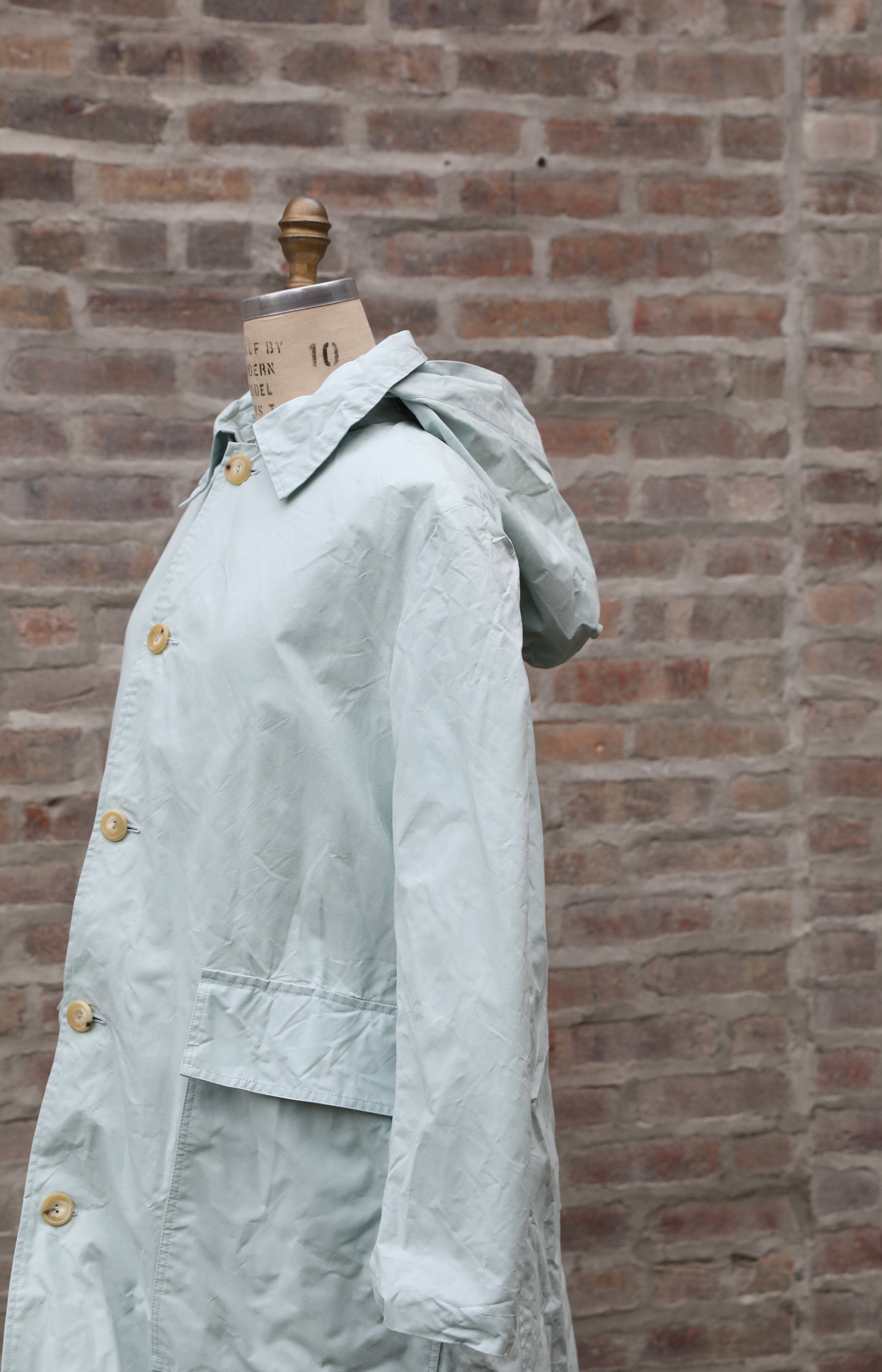 Ricorrrobe waxed cotton pale aqua rain coat. Has button front, oversized front patch pockets, collar, hood, center back vent with button closure and natural cotton lining. Offered as one size in size small.